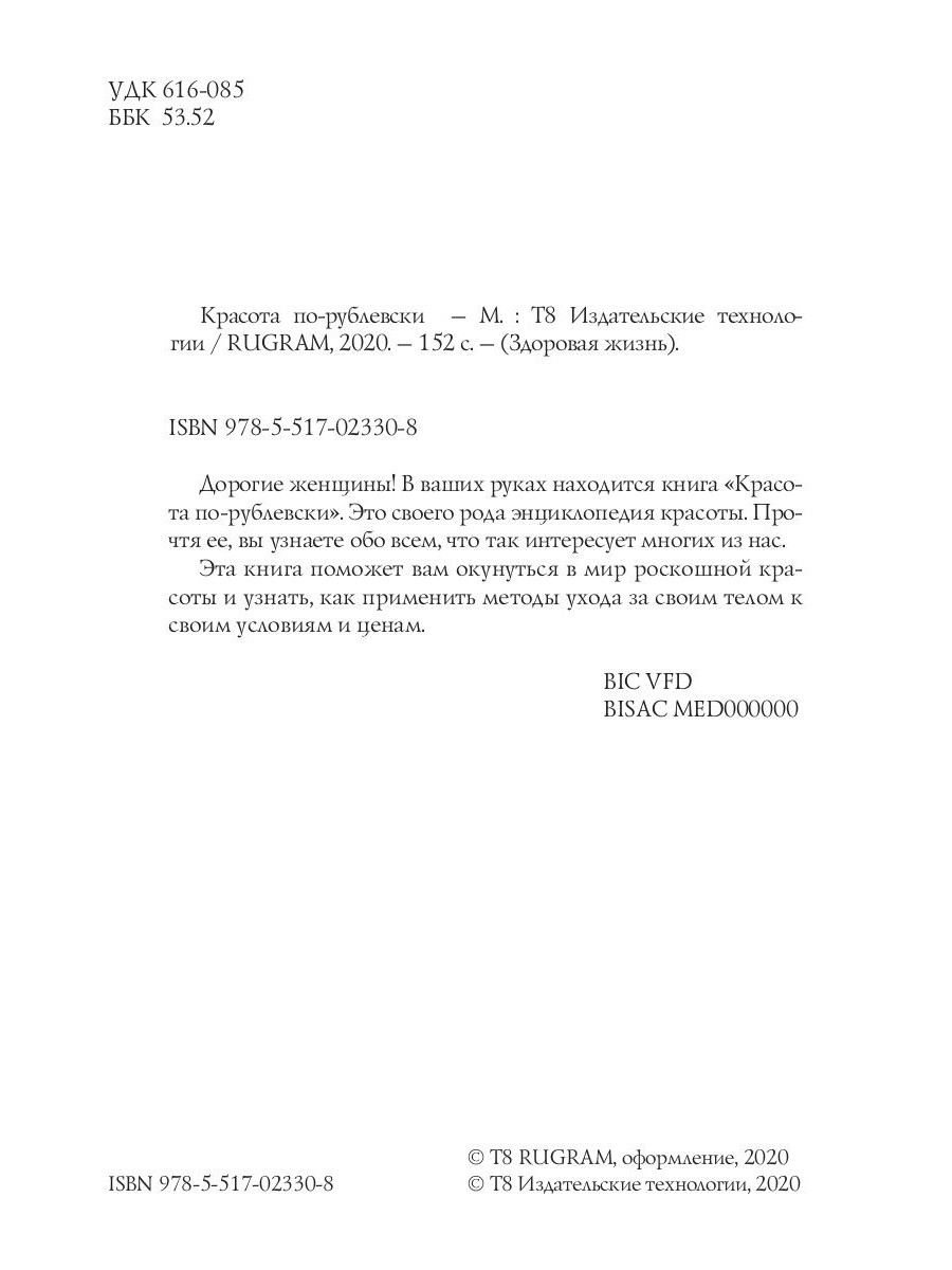 Дорогие женщины! В ваших руках находится книга «Красота по-рублевски». Это своего рода энциклопедия красоты. Прочтя ее, вы узнаете обо всем, что так интересует многих из нас. Эта книга поможет вам окунуться в мир роскошной красоты и узнать, как применить методы ухода за своим телом к своим условиям и ценам.| Издательство | Т8 RUGRAM |