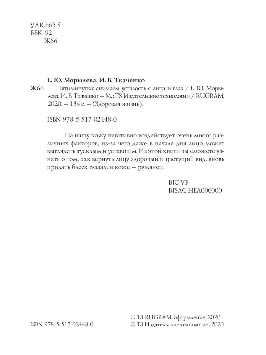 На нашу кожу негативно воздействует очень много различных факторов, из-за чего даже в начале дня лицо может выглядеть тусклым и уставшим. Из этой книги вы сможете узнать о том, как вернуть лицу здоровый и цветущий вид, вновь придать блеск глазам и коже - румянец.| Издательство | Т8 RUGRAM |