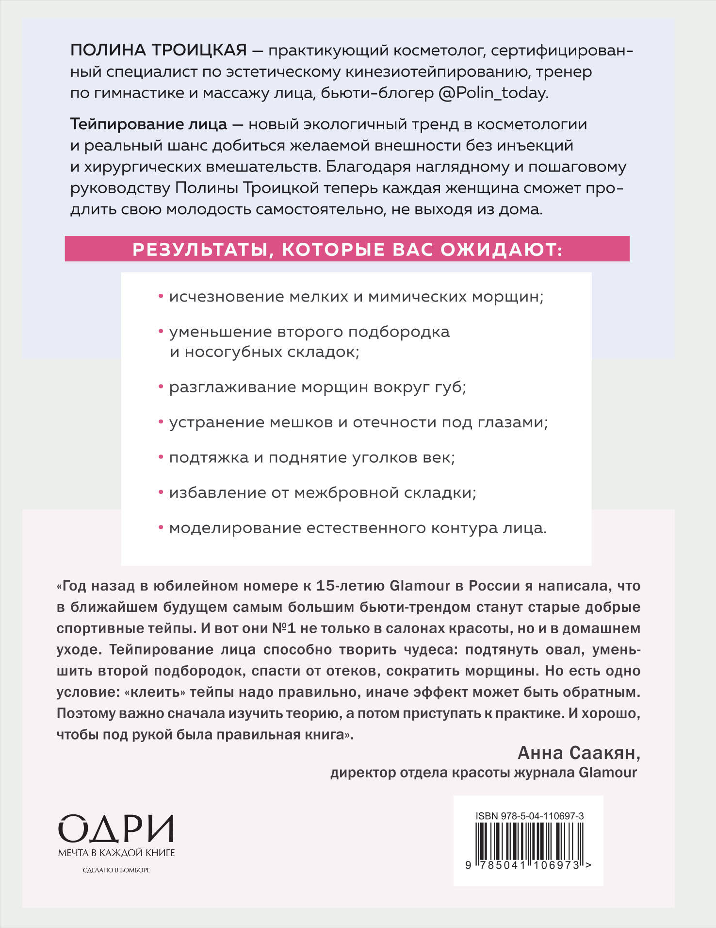 Полина Троицкая - практикующий косметолог, сертифицированный специалист по эстетическому кинезиотейпированию, тренер по гимнастике и массажу лица, бьюти-блогер @Polin_today. Тейпирование лица - новый экологичный тренд в косметологии и реальный шанс добиться желаемой внешности без инъекций и хирургических вмешательств. Благодаря наглядному и пошаговому руководству Полины Троицкой теперь каждая женщина сможет продлить свою молодость самостоятельно, не выходя из дома. РЕЗУЛЬТАТЫ, КОТОРЫЕ ВАС ОЖИДАЮТ: • исчезновение мелких и мимических морщин; • уменьшение второго подбородка и носогубных складок; • разглаживание морщин вокруг губ; • устранение мешков и отечности под глазами; • подтяжка и поднятие уголков век; • избавление от межбровной складки; • моделирование естественного контура лица. «Год назад в юбилейном номере к 15-летию Glamour в России я написала: в ближайшем будущем самым большим бьюти-трендом станут старые добрые спортивные тейпы. И вот они стали номером 1 не только в салонах красоты, но и в домашнем уходе. Тейпирование лица способно творить чудеса: подтянуть овал, уменьшить второй подбородок, спасти от отеков, сократить морщины. Но есть одно условие: "клеить" тейпы надо правильно, иначе эффект может быть обратным. Поэтому важно сначала изучить теорию, а потом приступать к практике. И хорошо, чтобы под рукой была правильная книга». - Анна Саакян, директор отдела красоты журнала Glamour| Издательство | ООО "Издательство "Эксмо" |