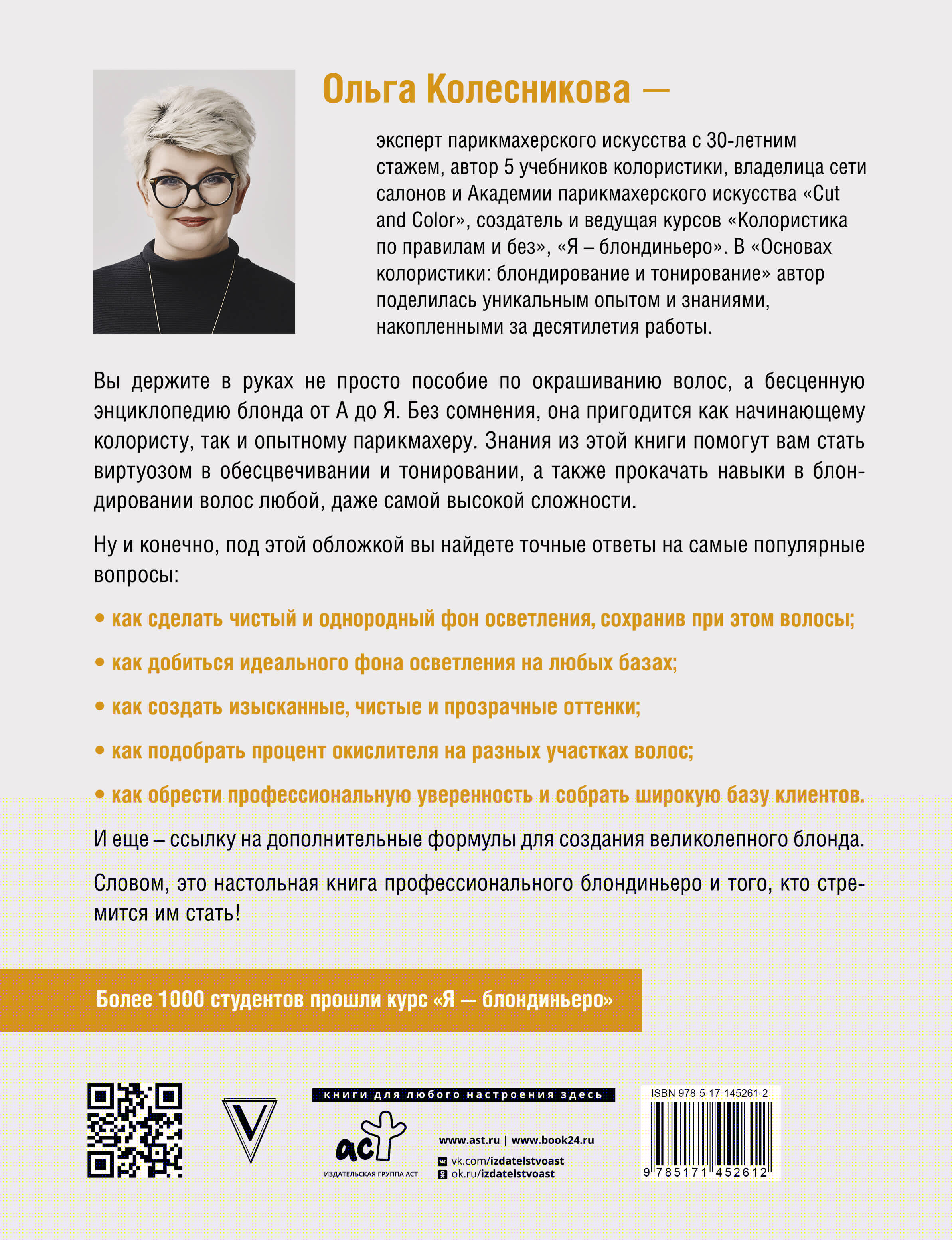 Ольга Колесникова, эксперт парикмахерского искусства с 30-летним стажем, автор 5 учебников колористики, владелица сети салонов и Академии парикмахерского искусства "Cut and Color", создатель и ведущая курсов "Колористика по правилам и без", "Я - блондиньеро". В "Основах колористики. Блондирование и тонирование" автор поделилась уникальным опытом и знаниями, накопленными за десятилетия работы. Вы держите в руках не просто пособие по окрашиванию волос, а бесценную энциклопедию блонда от А до Я. Без сомнения, она пригодится как начинающему колористу, так и опытному парикмахеру. Знания из этой книги помогут вам стать виртуозом в обесцвечивании и тонировании, а также прокачать навыки в блондировании волос любой, даже самой высокой сложности. Ну и конечно, под этой обложкой вы найдете точные ответы на самые популярные вопросы: • как сделать чистый и однородный фон осветления, сохранив при этом волосы; • как добиться идеального фона осветления на любых базах;как создать изысканные, чистые и прозрачные оттенки; • как подобрать процент окислителя на разных участках волос; • как обрести профессиональную уверенность и собрать широкую базу клиентов И еще - ссылку на дополнительные формулы для создания великолепного блонда. Словом, это настольная книга профессионального блондиньеро и того, кто стремится им стать!| Издательство | ИЗДАТЕЛЬСТВО "АСТ" |