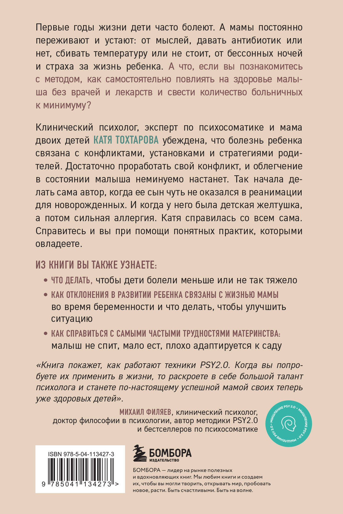 Первые годы жизни дети часто болеют. А мамы постоянно переживают и устают: от мыслей - давать антибиотик или нет, сбивать температуру или не стоит, от бессонных ночей и страха за жизнь ребенка. А что, если вы познакомитесь с методом, как самостоятельно повлиять на здоровье малыша без врачей и лекарств и свести количество больничных к минимуму? Клинический психолог, эксперт по психосоматике и мама двоих детей Катя Тохтарова убеждена, что болезнь ребенка связана с конфликтами, убеждениями и стратегиями родителей. Достаточно проработать свой конфликт, и облегчение в состоянии малыша неминуемо настанет. Так начала делать сама автор, когда ее сын чуть не оказался в реанимации для новорожденных. И когда у него была детская желтушка, а потом сильная аллергия, Катя справилась со всем сама. Справитесь и вы при помощи понятных практик, которыми овладеете. Из книги вы также узнаете: 1. Что делать, чтобы дети болели меньше или не так тяжело. 2. Как отклонения в развитии ребенка связаны с жизнью мамы во время беременности и что делать, чтобы улучшить ситуацию. 3. Почему болеют именно дети, а не сами мамы. 4. Как справиться с самыми частыми трудностями материнства: малыш не спит, мало ест, ему нужно адаптироваться к саду или школе и т.д. «Книга покажет, как работают техники PSY2.0. Когда вы попробуете их применить в жизни, то раскроете в себе большой талант психолога и станете по-настоящему успешной мамой своих теперь уже здоровых детей». - Михаил Филяев, клинический психолог, доктор философии в психологии, автор методики PSY2.0 и бестселлеров по психосоматике| Издательство | ООО "Издательство "Эксмо" |