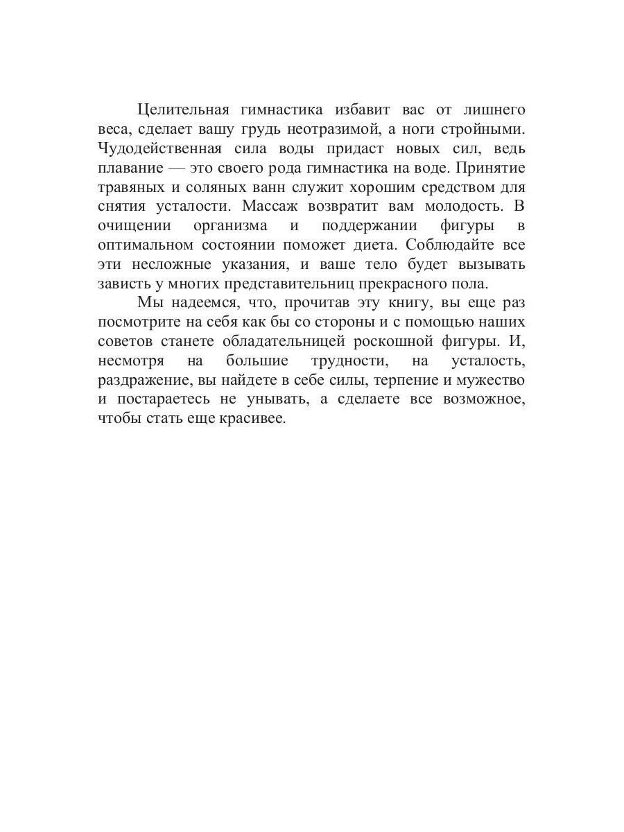«Секреты роскошной фигуры» - книга, рассчитанная на широкий круг читателей. Но в первую очередь она адресована женщинам, желающим всегда быть неотразимыми. В ней содержатся полезные советы, как сохранить идеальную фигуру независимо от возраста, приведены физические упражнения, которые позволят вам прекрасно выглядеть и всегда ощущать себя энергичной и бодрой, а кроме того, практические советы по уходу за телом (правила массажа, косметика для тела и т. д.), за руками и ногами, и многое другое. Все это поможет вам стать вполне обаятельной и привлекательной, не прилагая к этому особых усилий. Эта книга - идеальный подарок для любой женщины, желающей стать красивой.