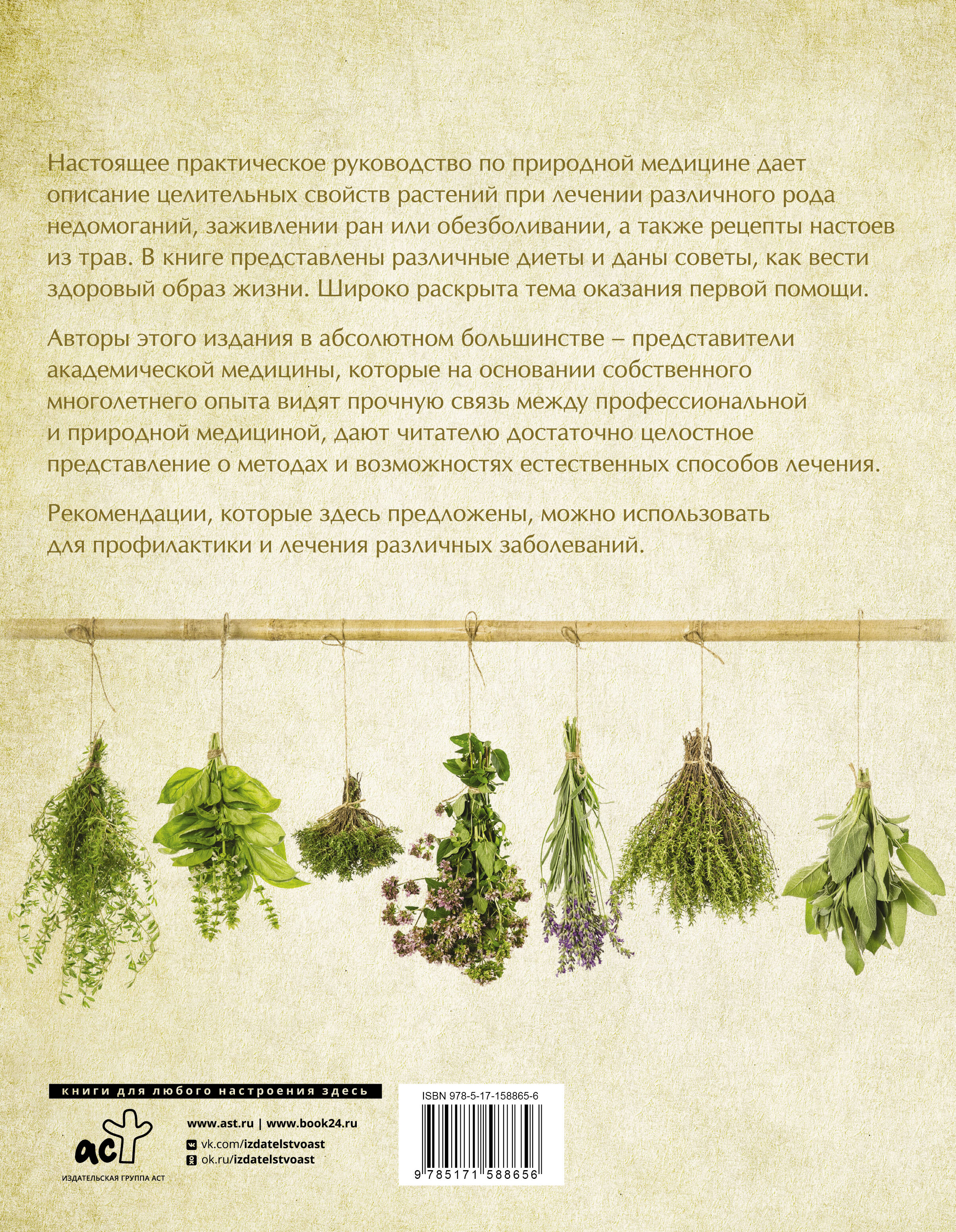 Настоящее практическое руководство по природной медицине даёт описание целительных свойств растений при лечении различного рода недомоганий, заживлении ран или обезболивании, а также рецепты настоев из трав. В книге представлены различные диеты и даны советы, как вести здоровый образ жизни. Широко раскрыта тема оказания первой помощи. Авторы этого издания в абсолютном большинстве - представители академической медицины, которые на основании собственного многолетнего опыта видят прочную связь между профессиональной и природной медициной, дают читателю достаточно целостное представление о методах и возможностях естественных способов лечения. Рекомендации, которые здесь предложены, можно использовать для профилактики и лечения различных заболеваний.| Издательство | ИЗДАТЕЛЬСТВО "АСТ" |