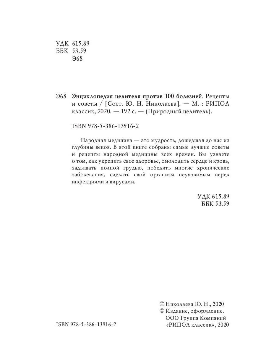 Аннотация: Энциклопедия целителя против 100 болезней. Рецепты и советы