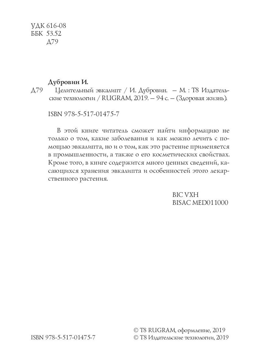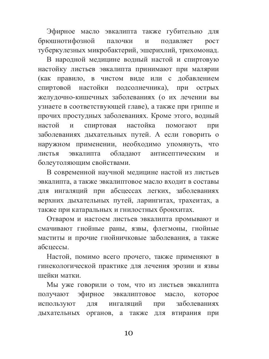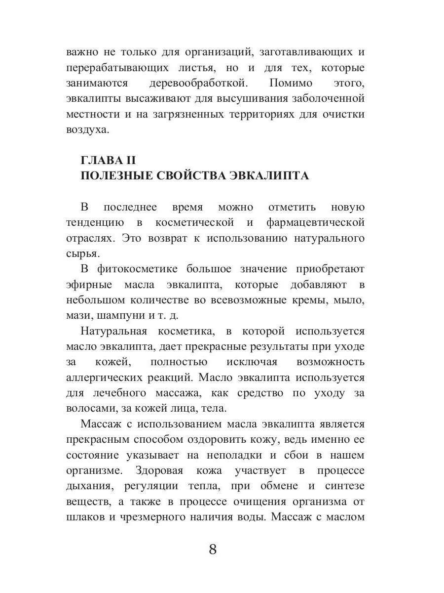 В этой книге читатель сможет найти информацию не только о том, какие заболевания и как можно лечить с помощью эвкалипта, но и о том, как это растение применяется в промышленности, а также о его косметических свойствах. Кроме того, в книге содержится много ценных сведений, касающихся хранения эвкалипта и особенностей этого лекарственного растения.| Издательство | Т8 RUGRAM |