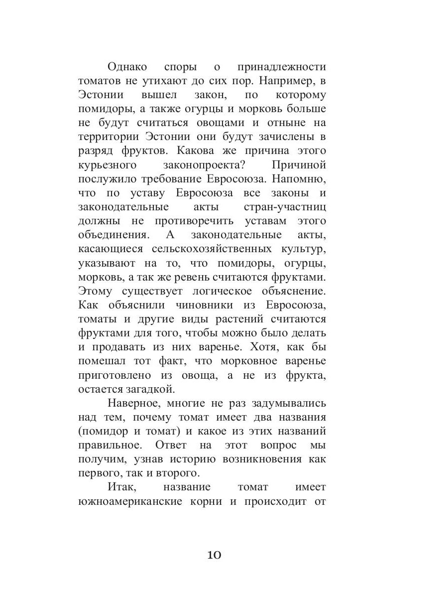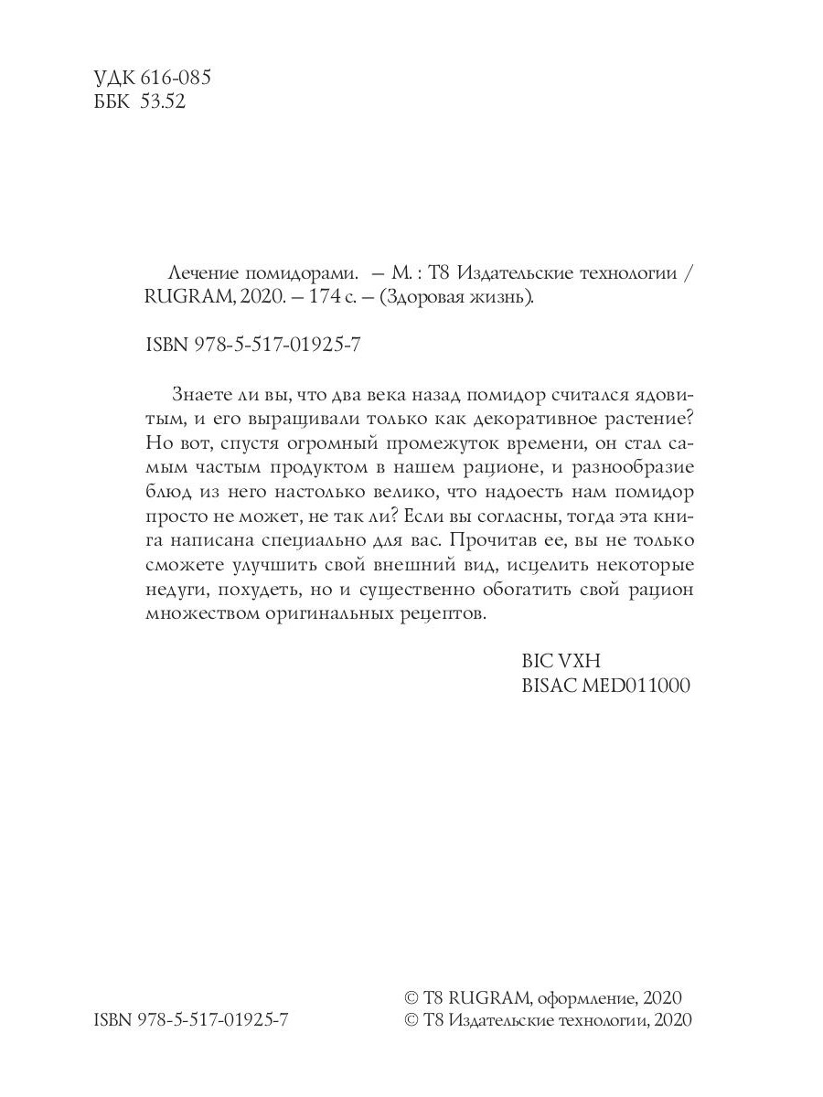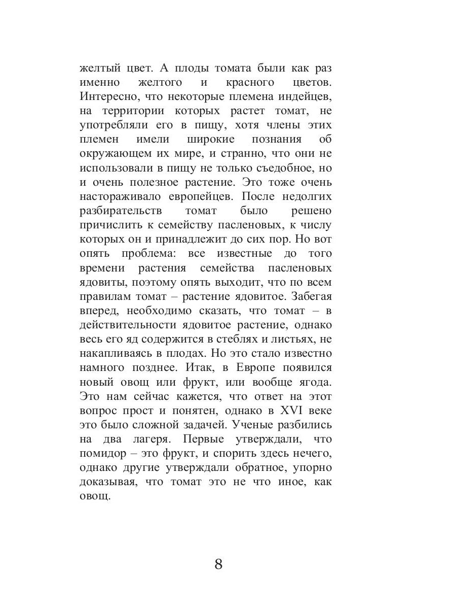Знаете ли вы, что два века назад помидор считался ядовитым, и его выращивали только как декоративное растение? Но вот, спустя огромный промежуток времени, он стал самым частым продуктом в нашем рационе, и разнообразие блюд из него настолько велико, что надоесть нам помидор просто не может, не так ли? Если вы согласны, тогда эта книга написана специально для вас. Прочитав ее, вы не только сможете улучшить свой внешний вид, исцелить некоторые недуги, похудеть, но и существенно обогатить свой рацион множеством оригинальных рецептов.| Издательство | Т8 RUGRAM |