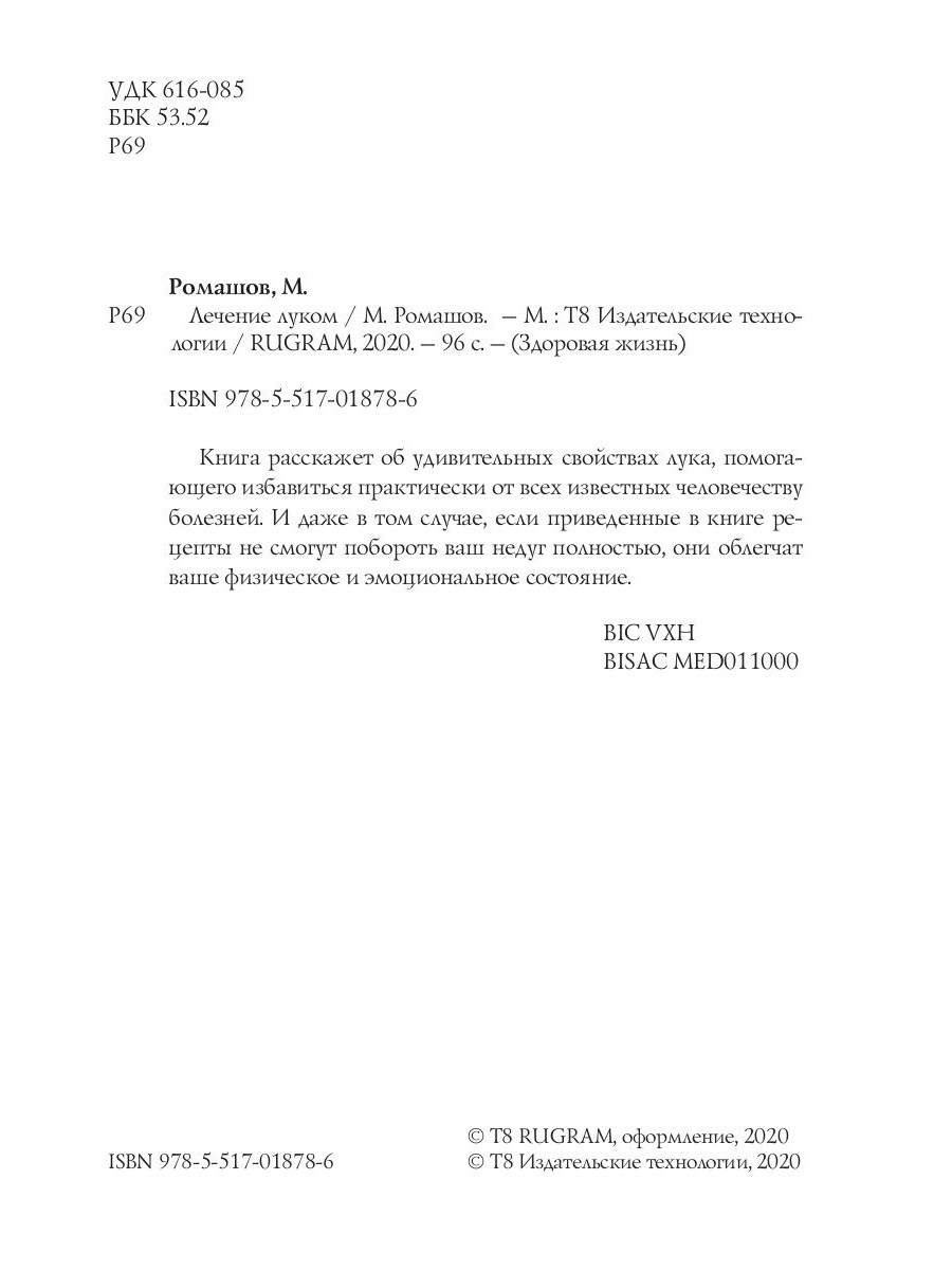 Книга расскажет об удивительных свойствах лука, помогающего избавиться практически от всех известных человечеству болезней. И даже в том случае, если приведенные в книге рецепты не смогут побороть ваш недуг полностью, они облегчат ваше физическое и эмоциональное состояние.| Издательство | Т8 RUGRAM |