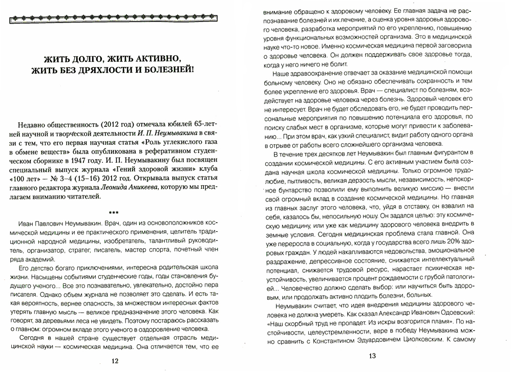 Данная книга познакомит вас со взглядами на здоровье и оздоровительной системой профессора И. П. Неумывакина - одного из основоположников космической, традиционной народной медицины, известного автора и популяризатора здорового образа жизни не только в нашей стране. Все, что использовалось в официальной медицине, оказалось нельзя использовать в космической медицине из-за громоздкости, сложности в эксплуатации, наличия побочных эффектов и т. п. Благодаря многим разработкам и открытиям И. П. Неумывакина с большим коллективом медиков, работающих в космонавтике, было создано уникальное оборудование для космических полетов, что может использовать и «земная» медицина. И. П. Неумывакин утверждает, что «расчленение» физиологии человека на более чем 100 медицинских специализаций, увлечение использованием в лечении искусственных средств привело к тому, что неизлечимых заболеваний становится все больше, и что особенно тревожно, несмотря на «достижения» официальной медицины. А на самом деле, как доказывает профессор И. П. Неумывакин на примере таких заболеваний, как гипертония, глаукома и других, что заболеваний нет, а есть состояние, которое можно восстановить с помощью природных средств и желания самого человека быть здоровым.| Издательство | Диля |