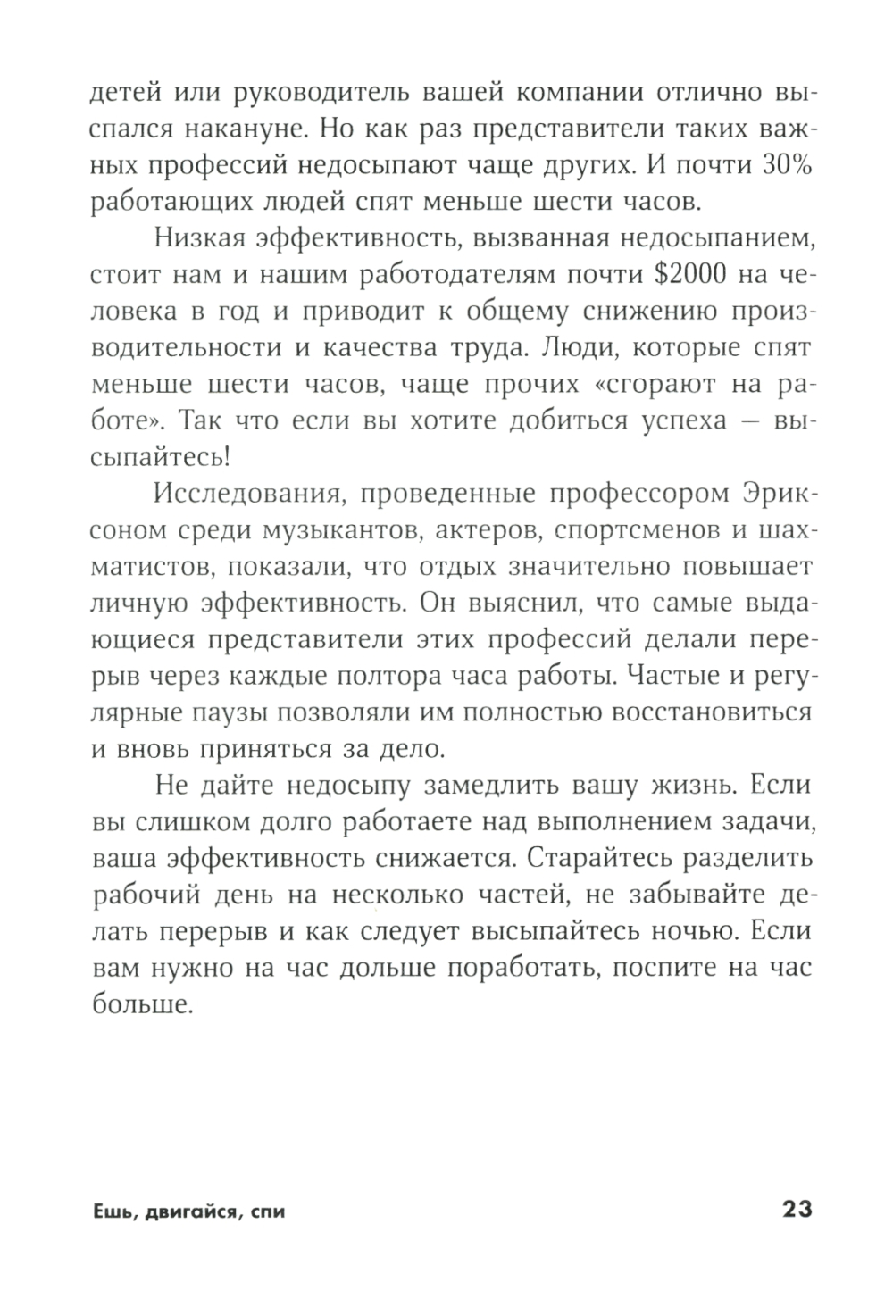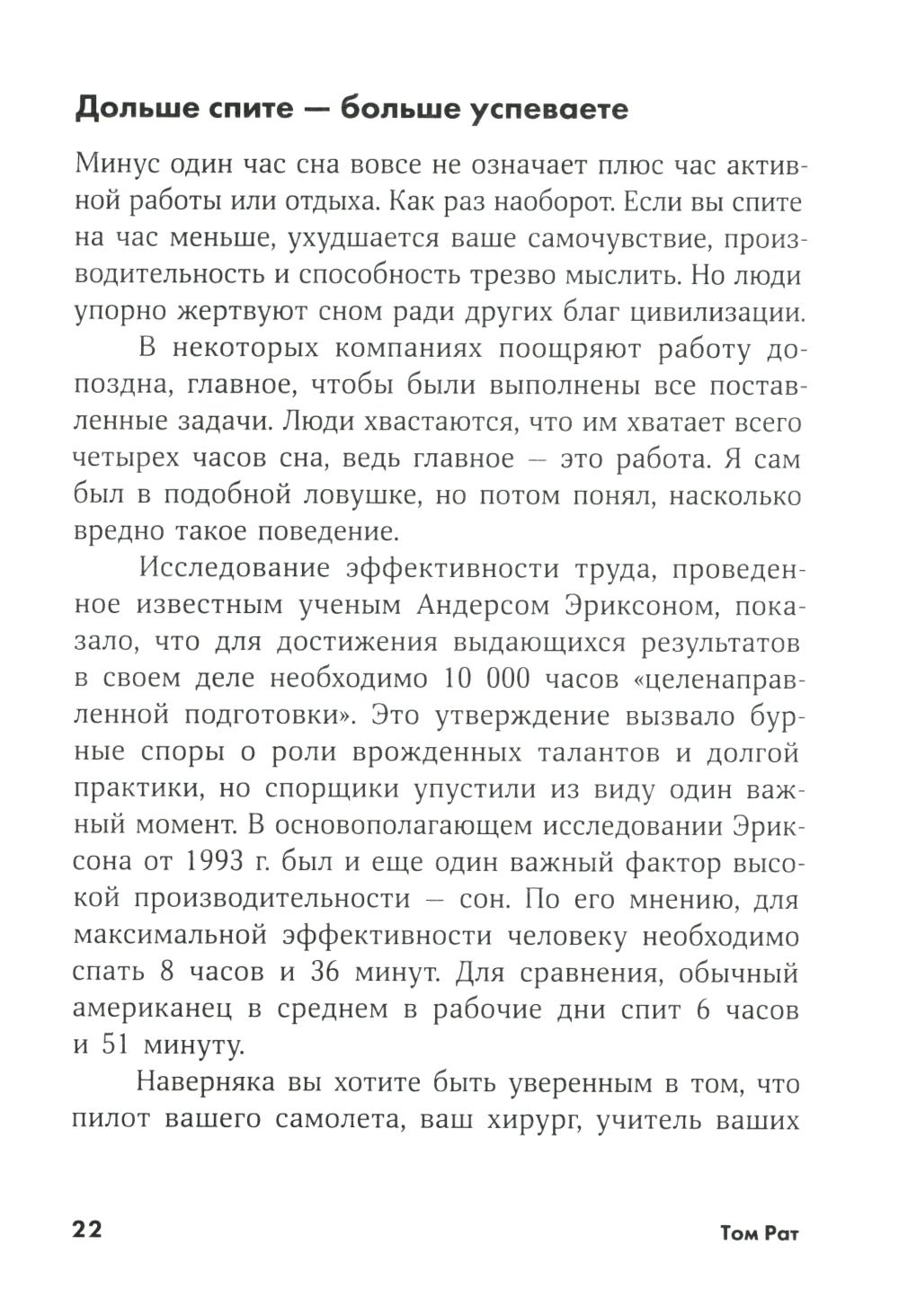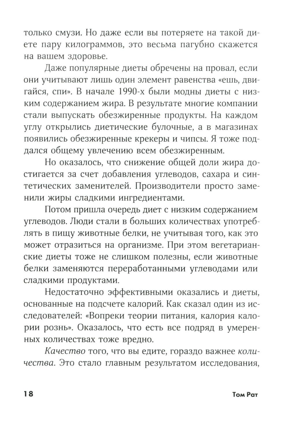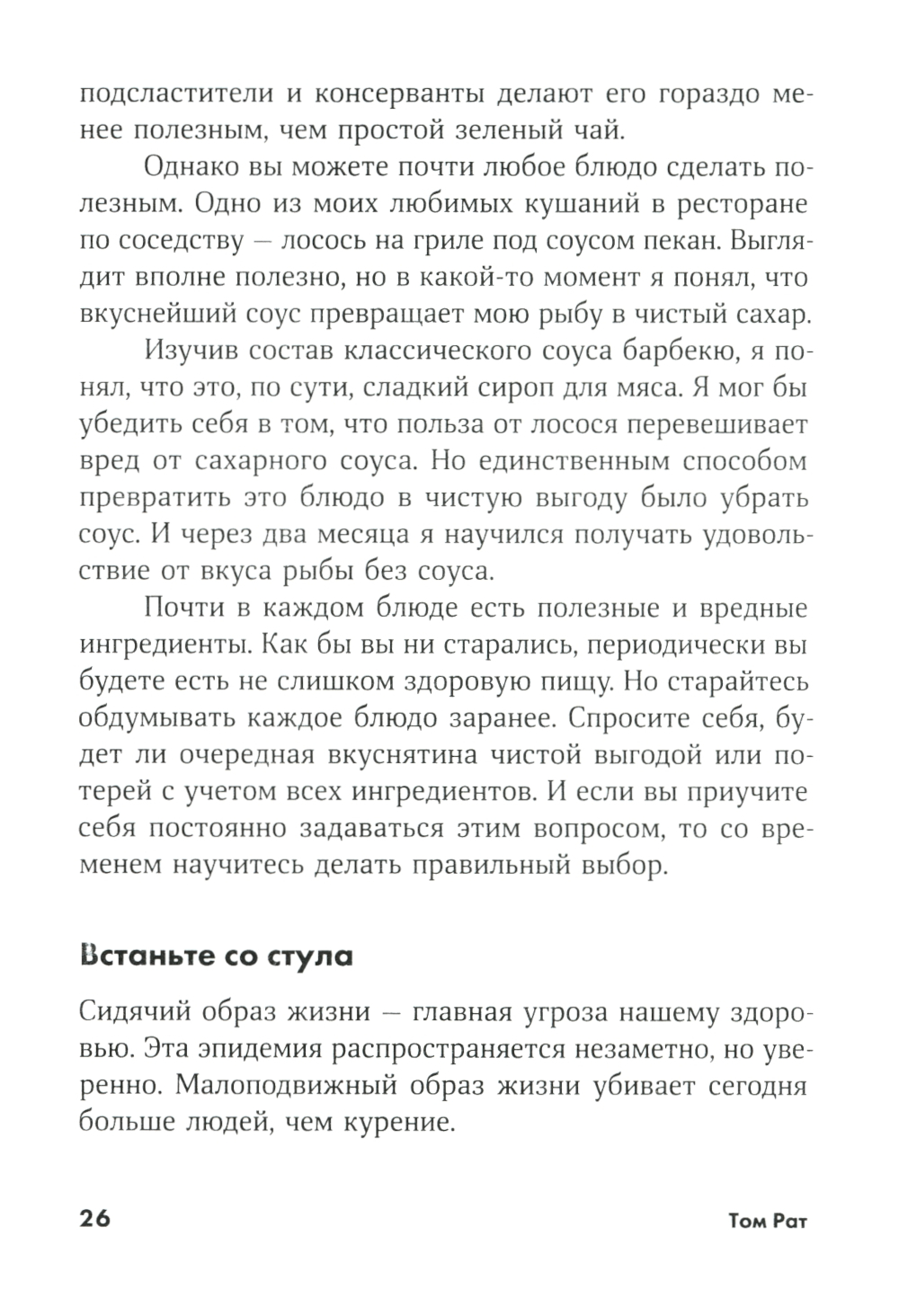 Мы привыкли к тому, что переход к здоровому образу жизни требует каких-то кардинальных перемен, например полного отказа от никотина и алкоголя, регулярных спортивных занятий, смены места жительства. Во многом поэтому мы не уделяем должного внимания «мелочам» - ежедневным решениям по поводу того, что съесть на завтрак: овсянку или бутерброд? Позвонить коллеге или пройтись до его кабинета? Лечь поспать пораньше или позволить себе немного расслабиться и посмотреть допоздна любимый сериал? А ведь именно эти «мелочи», как утверждает Том Рат, оказывают существенное влияние на продолжительность и качество нашей жизни. Не важно, какой образ жизни вы ведете сегодня, всегда можно измениться, чтобы прожить долгую и полноценную жизнь.| Издательство | Альпина Паблишер |