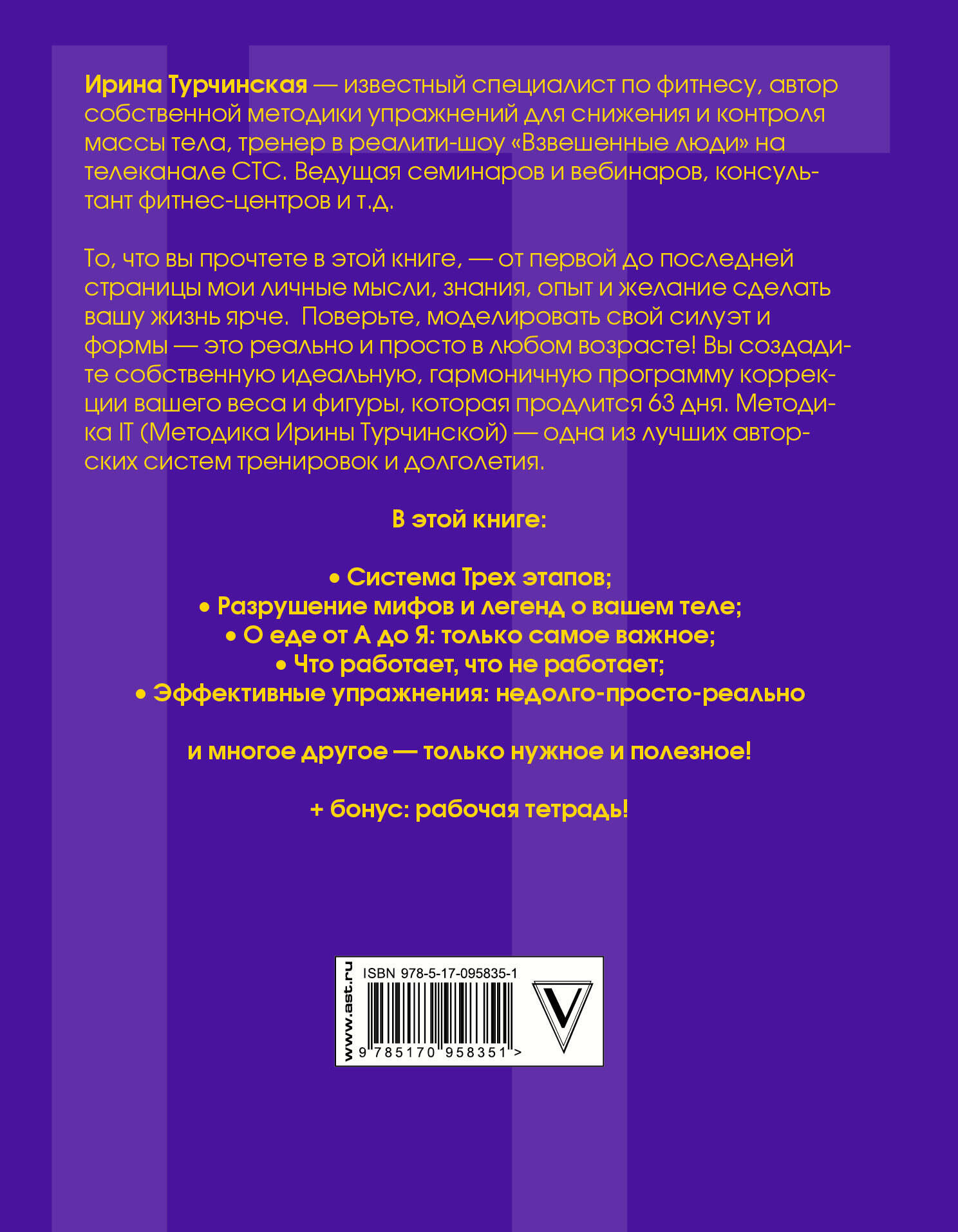 Ирина Турчинская - известный специалист по фитнесу, автор собственной методики упражнений для снижения и контроля массы тела, тренер в реалити-шоу "Взвешенные люди" на телеканале СТС. Ведущая семинаров и вебинаров, консультант фитнес-центров и т.д. То, что вы прочтете в этой книге, - от первой до последней страницы мои личные мысли, знания, опыт и желание сделать вашу жизнь ярче. Поверьте, моделировать свой силуэт и формы - это реально и просто в любом возрасте! Вы создадите собственную идеальную, гармоничную программу коррекции вашего веса и фигуры, которая продлится 63 дня. Методика IT (Методика Ирины Турчинской) - одна из лучших авторских систем тренировок и долголетия.| Издательство | Издательство "АСТ" |
