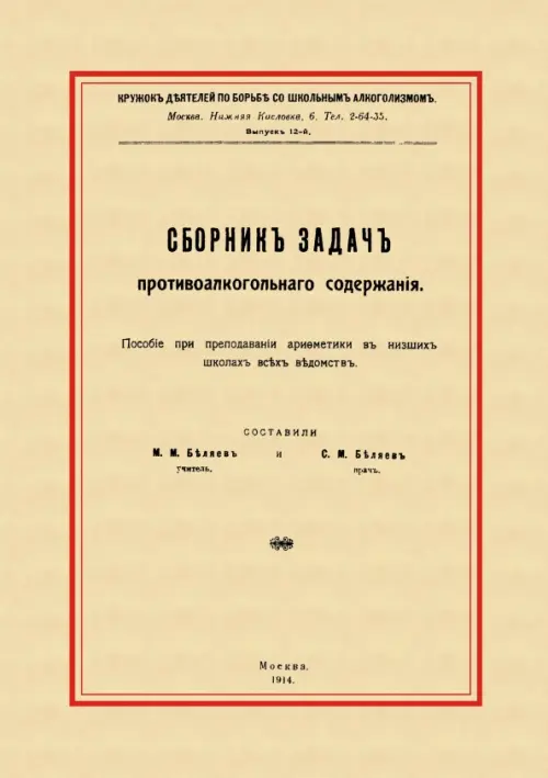 Репринт с издания. Москва 1914. Смешные (сегодня) задачи. Пособие при преподавании арифметики в низших школах всех ведомств. Кружок деятелей по борьбе со школьным алкоголизмом. Составили М. М. Беляев (учитель) и С. М. Беляев (врач). Тираж 30 экз. выполнен по технологии print-on-demand.