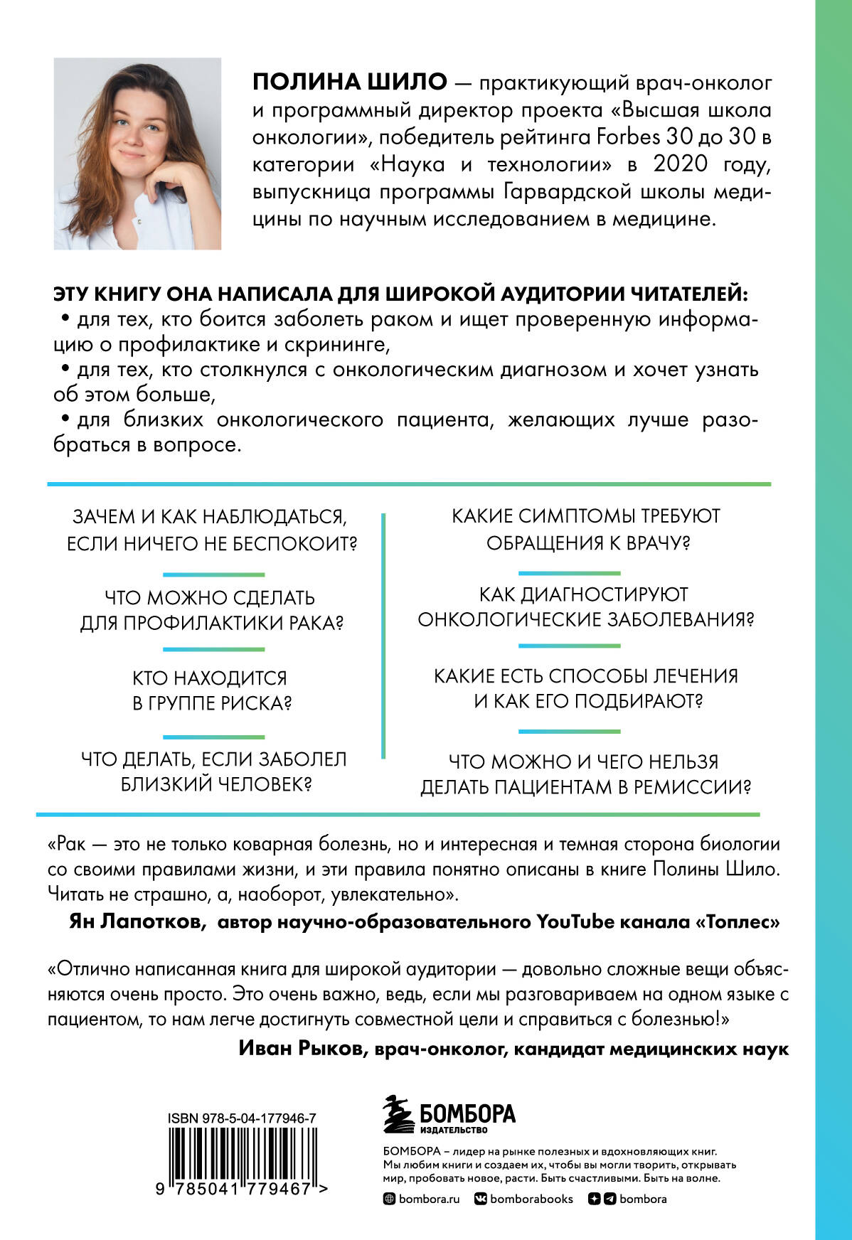 Эта книга - для самой широкой аудитории людей, которые хотят узнать об онкологии больше. Практикующий онколог-химиотерапевт Полина Шило мягко снимает многочисленные страхи, связанные с онкологическими заболеваниями, и подсказывает, что делать и как найти надежду. В книге вы найдете: • актуальную и научно подтвержденную информацию о симптомах онкологических заболеваний, их диагностики и лечении; • профессиональные медицинские рекомендации, что можно и нельзя делать пациентам с онкологическим диагнозом; • истории из жизни и медицинской практики; • распространенные вопросы и ответы на них.| Издательство | ООО "Издательство "Эксмо" |