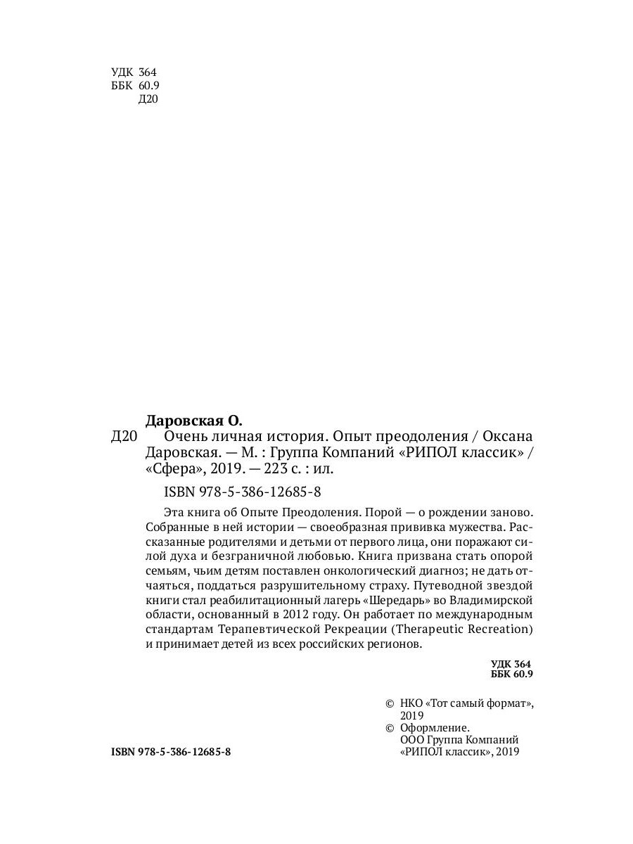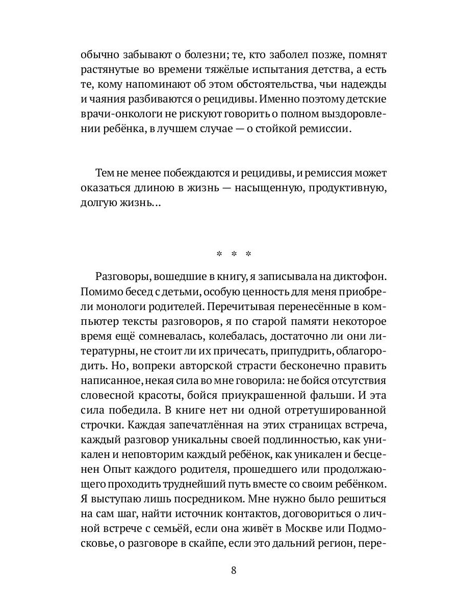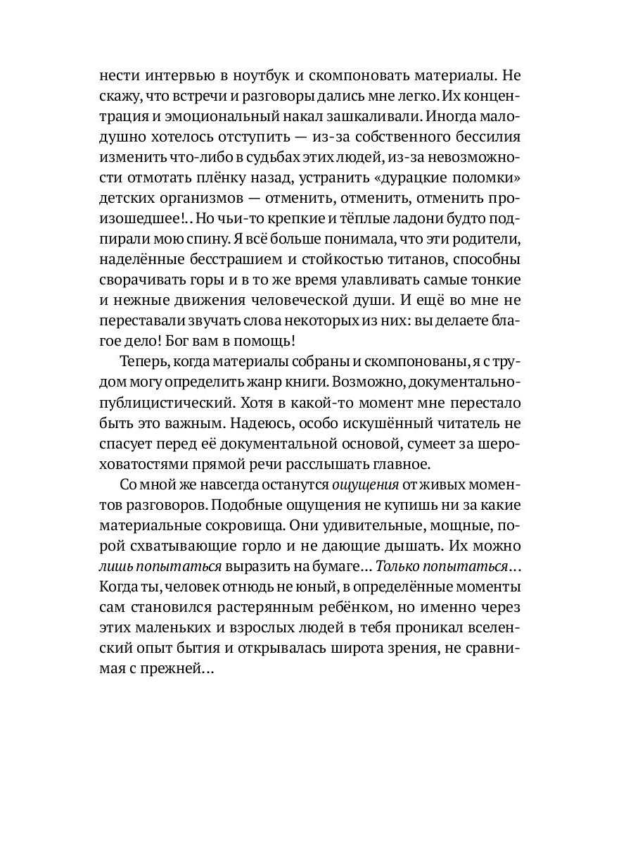 Эта книга об Опыте Преодоления. Порой - о рождении заново. Собранные в ней истории - своеобразная прививка мужества. Рассказанные родителями и детьми от первого лица, они поражают силой духа и безграничной любовью. Книга призвана стать опорой семьям, чьим детям поставлен онкологический диагноз; не дать отчаяться, поддаться разрушительному страху. Путеводной звездой книги стал реабилитационный лагерь «Шередарь» во Владимирской области, основанный в 2012 году. Он работает по международным стандартам Терапевтической Рекреации (Therapeutic Recreation) и принимает детей из всех российских регионов.| Издательство | Рипол Классик |
