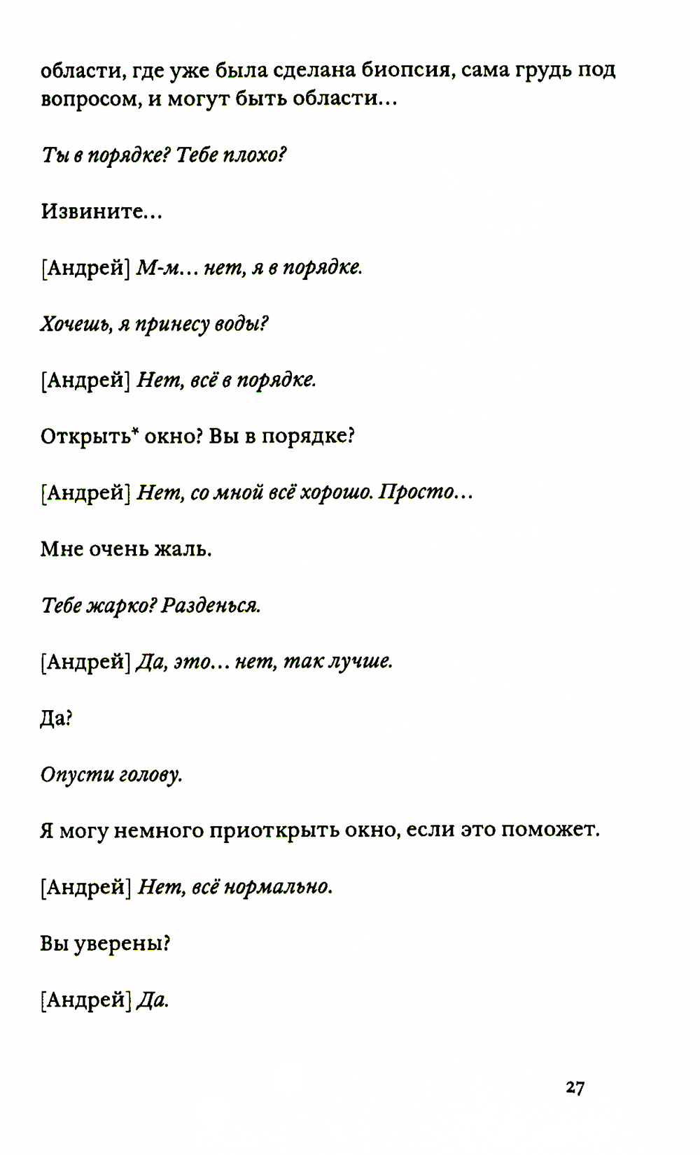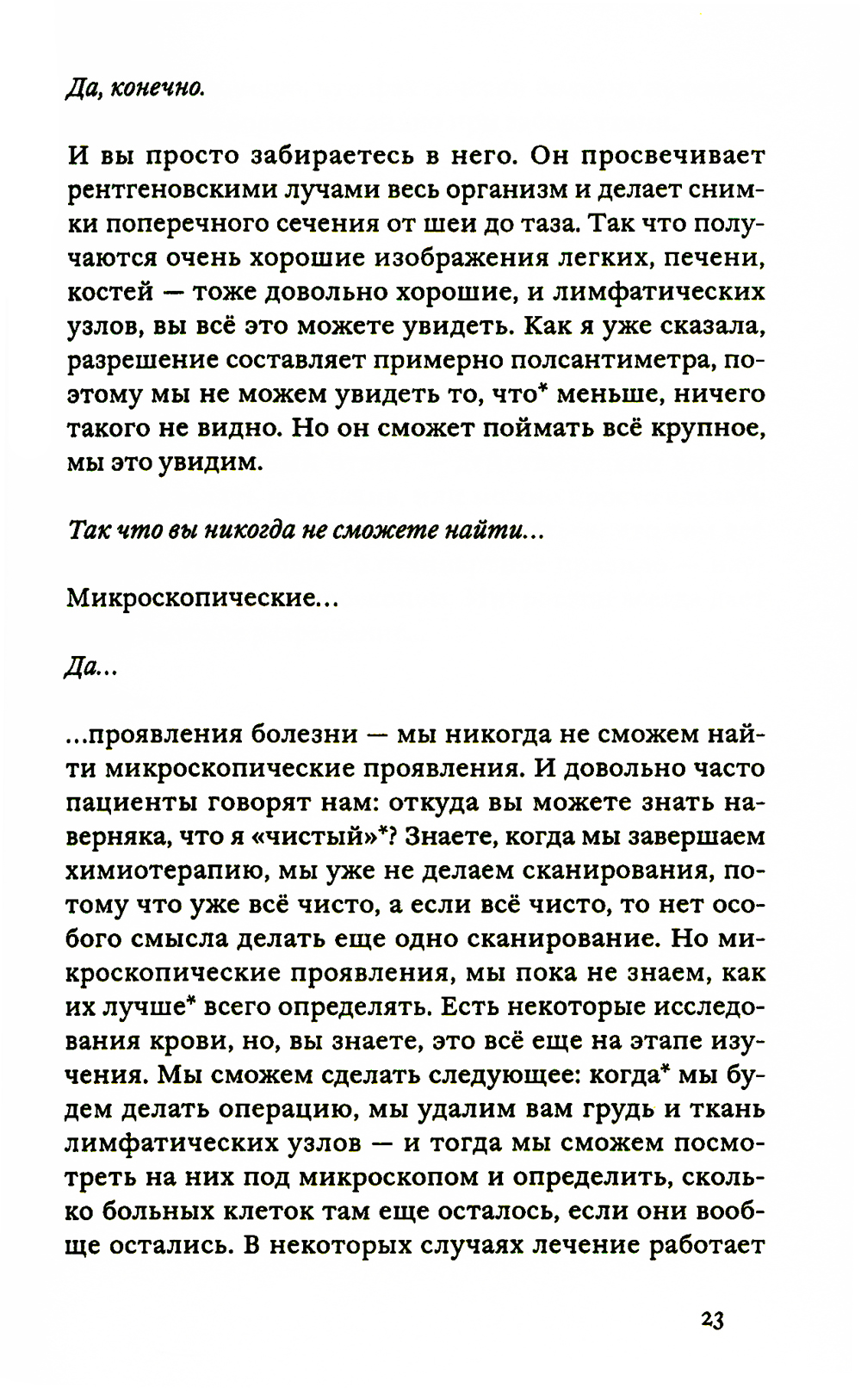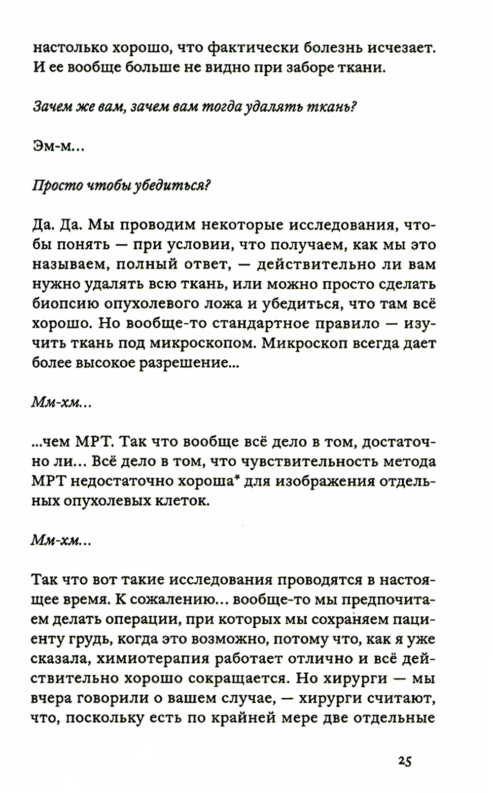 В этой книге, написанной в жанре документальной прозы (verbatim), два параллельных текста соединяются в один - текст о болезни и о жизни. На правой полосе публикуется дословная расшифровка беседы онколога с Кэролайн Кларк: врач рассказывает ей и ее мужу о диагнозе и предстоящем лечении. Паузы, междометия и другие, казалось бы, малозначительные детали воссоздают драматургию ситуации. По левой полосе идут воспоминания, размышления и поэтические ассоциации из записных книжек Кэролайн, которые она интуитивно соединяет со словами врача. Как и другие издания серии «Как жить», книга транслирует читателю личный опыт, мужество, веру, оптимизм и эмпатию. Она будет интересна тем, кому пришлось узнать о своем тяжелом диагнозе или о заболевании близких, а также самому широкому кругу читателей.| Издательство | Олимп-Бизнес |
