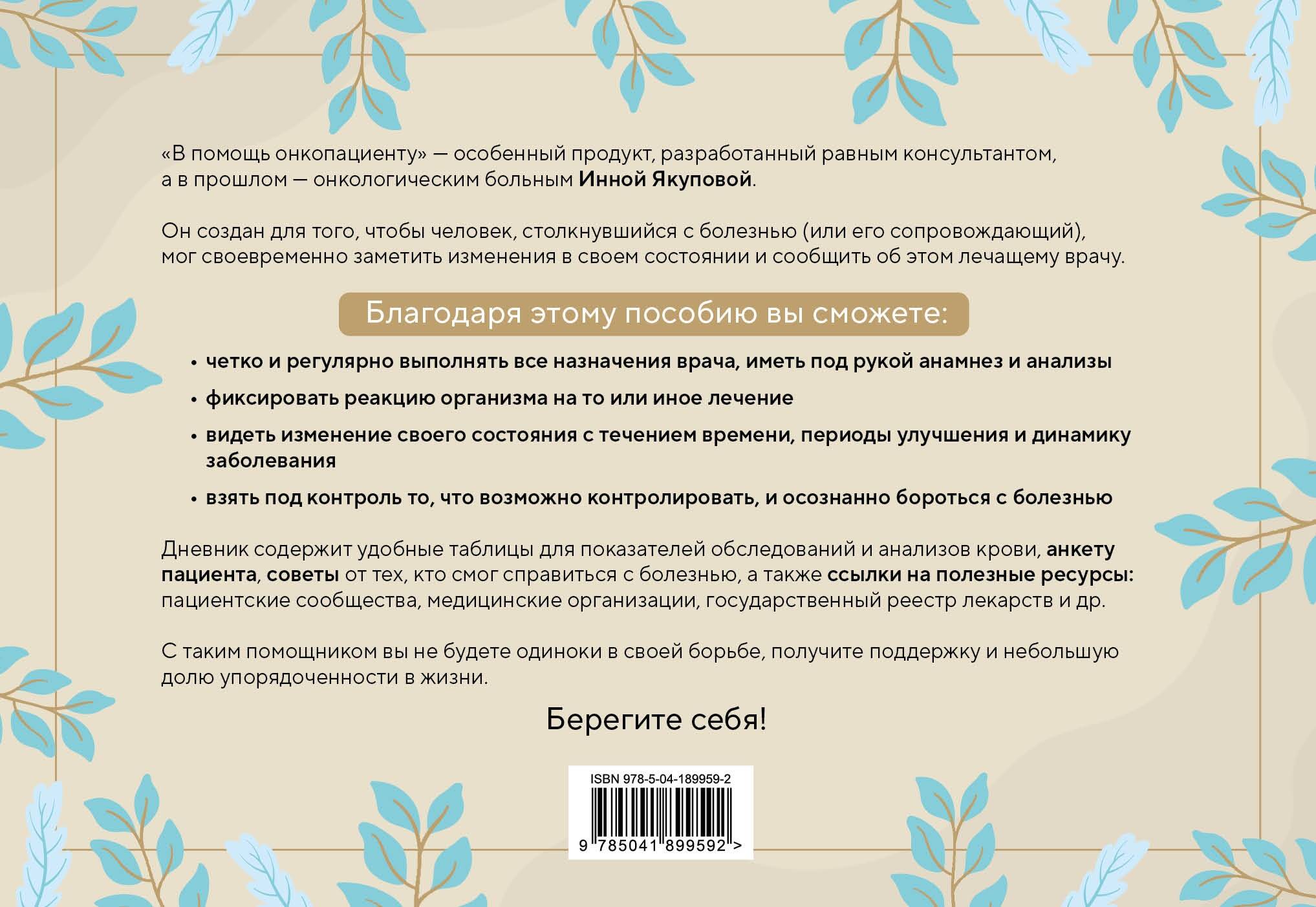 Ежегодно в мире миллионы людей заболевают онкологическими заболеваниями. Услышав этот страшный диагноз, совсем не чувствуешь себя готовым бороться. Автор дневника «В помощь онкопациенту» Инна Якупова сама в прошлом была онкопациентом. Она прошла этот нелёгкий путь и сейчас делится своим опытом, для того, чтоб другие проходили этот путь легче! Открыв дневник, вы найдете: • Поддерживающие слова от человека, пережившего онкологию. • Анкету, куда занесете важнейшие сведения о болезни, чтобы они всегда были под рукой. • Страницы для ежедневного отслеживания своего состояния. • Таблицы для показателей обследований и анализов крови. • *Ссылки на полезные ресурсы (пациентские сообщества, медицинские организации, государственный реестр лекарств и др.).| Издательство | ООО "Издательство "Эксмо" |