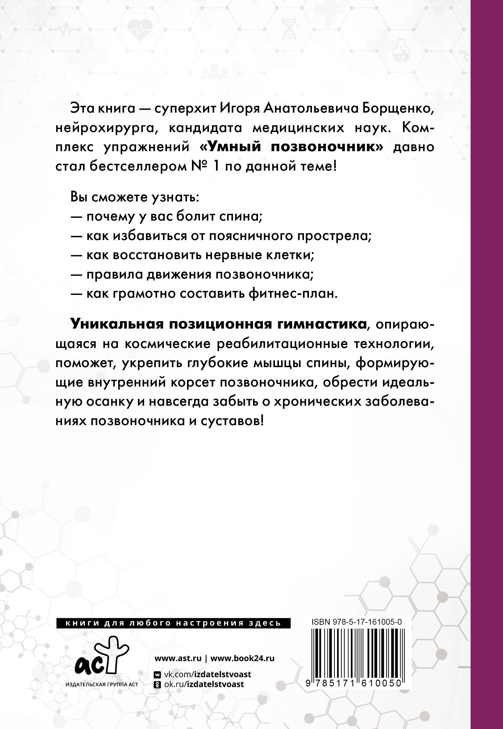 Эта книга - суперхит Игоря Анатольевича Борщенко, нейрохирурга, кандидата медицинских наук. Комплекс упражнений "Умный позвоночник" давно стал бестселлером № 1 по данной теме! Вы сможете узнать: - почему у вас болит спина; - как избавиться от поясничного прострела; - как восстановить нервные клетки; - правила движения позвоночника; - как грамотно составить фитнес-план. Уникальная позиционная гимнастика, опирающаяся на космические реабилитационные технологии, поможет, укрепить глубокие мышцы спины, формирующие внутренний корсет позвоночника, обрести идеальную осанку и навсегда забыть о хронических заболеваниях позвоночника и суставов!| Издательство | Издательство "АСТ" |