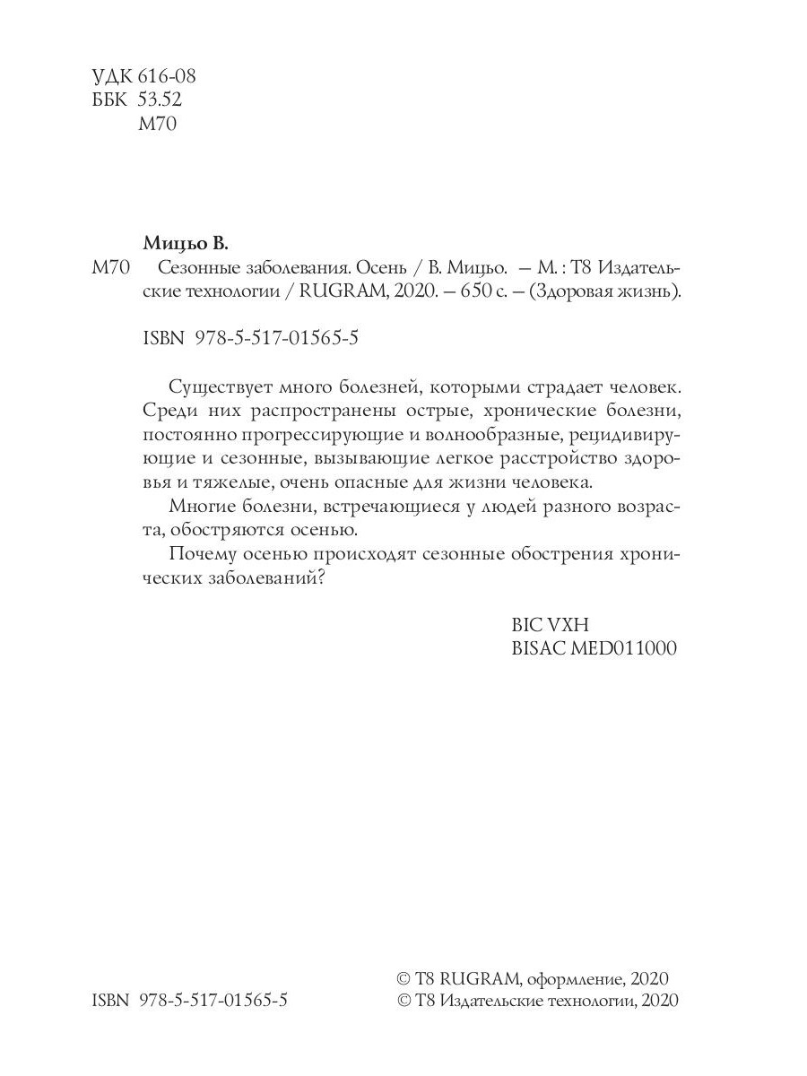 Существует много болезней, которыми страдает человек. Среди них распространены острые, хронические болезни, постоянно прогрессирующие и волнообразные, рецидивирующие и сезонные, вызывающие легкое расстройство здоровья и тяжелые, очень опасные для жизни человека. Многие болезни, встречающиеся у людей разного возраста, обостряются осенью. Почему осенью происходят сезонные обострения хронических заболевании?| Издательство | Т8 RUGRAM |