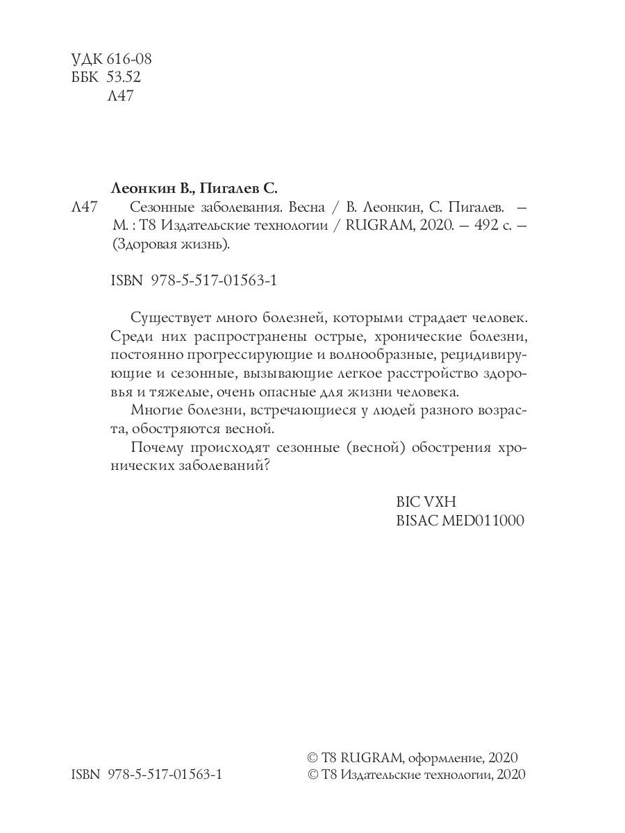 Существует много болезней, которыми страдает человек. Среди них распространены острые, хронические болезни, постоянно прогрессирующие и волнообразные, рецидивирующие и сезонные, вызывающие легкое расстройство здоровья и тяжелые, очень опасные для жизни человека. Многие болезни, встречающиеся у людей разного возраста, обостряются весной. Почему происходят сезонные (весной) обострения хронических заболеваний?| Издательство | Т8 RUGRAM |