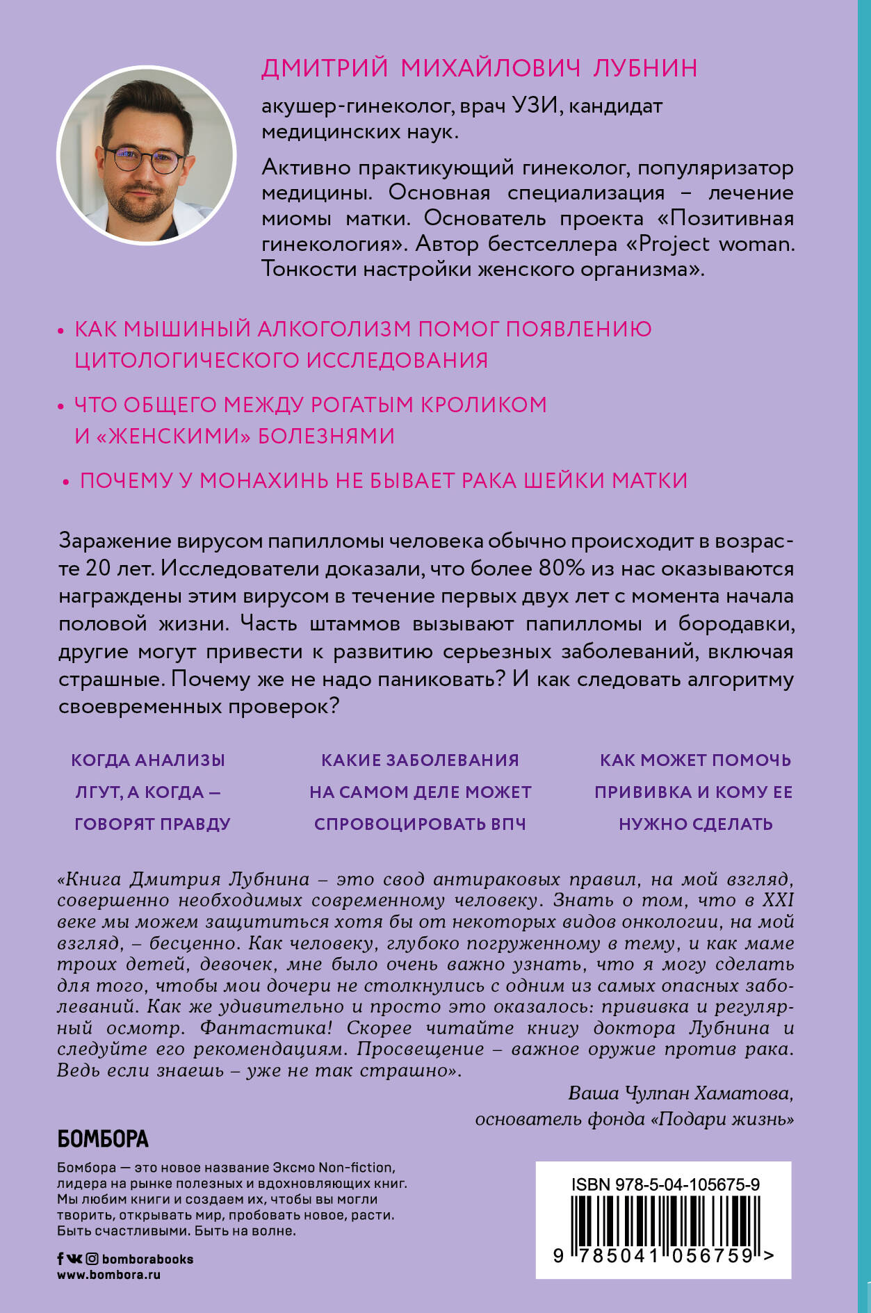 Вирус папилломы человека - один из самых спорных и опасных в истории человечества. Существующий более 300 млн лет, он, с одной стороны, как вирус гриппа, стал нашим безобидным соседом, а с другой стороны, научился убивать тихо и бессимптомно. Во всем мире от вызванного ВПЧ рака шейки матки погибает от 2 до 4% женщин. В России - на порядок больше. Паника, страх и огромное количество мифов вокруг этого странного вируса создали ему ореол таинственности и враждебности. - Какие типы ВПЧ безобидны, а какие онкогенны? - Как во всем мире защищаются от болезни еще в 14 лет? - Почему проверяться надо только через 3 года после первого полового контакта? - Что имеет в виду врач, читая вашу цитологию? Интересные факты об истории открытия, полезная информация о способах защиты и важные факты о собственном здоровье в 20, 30, 40, 50 и 65 лет в новой книге самого известного российского гинеколога Дмитрия Лубнина, автора бестселлера «Project woman».| Издательство | ООО "Издательство "Эксмо" |