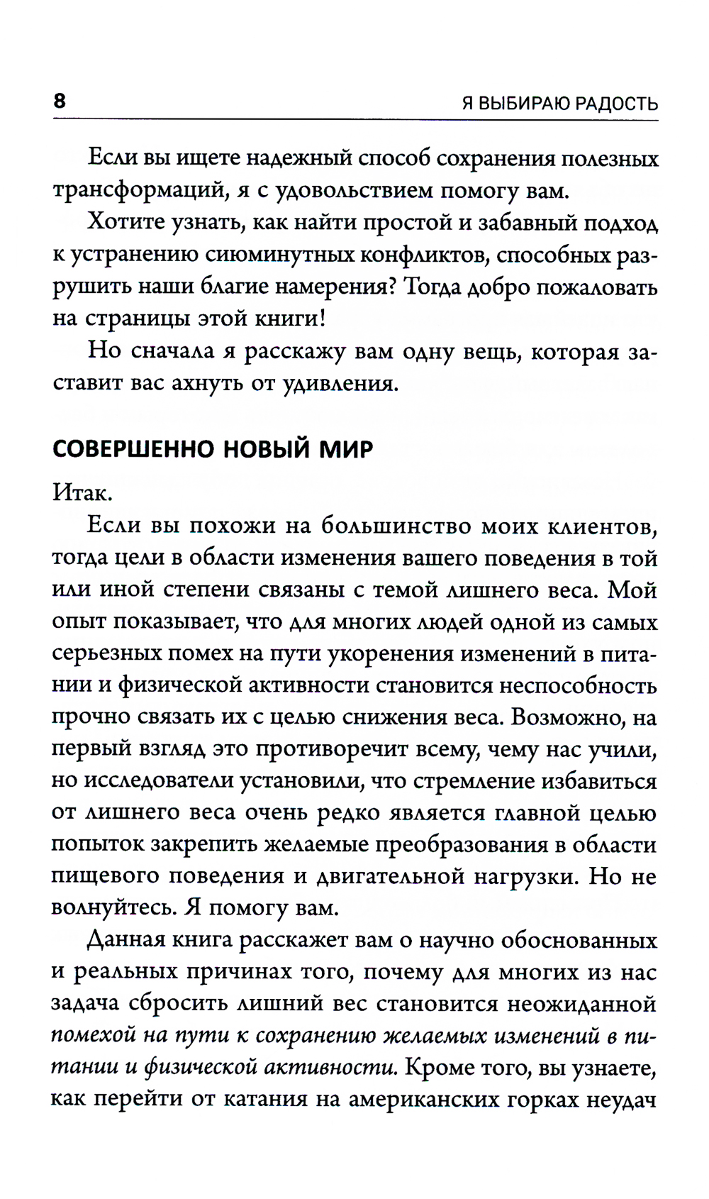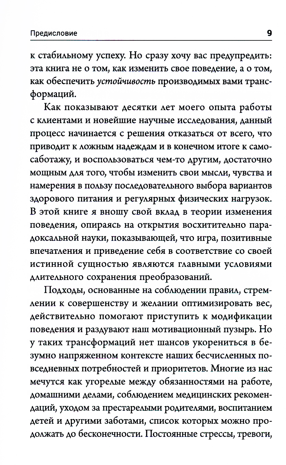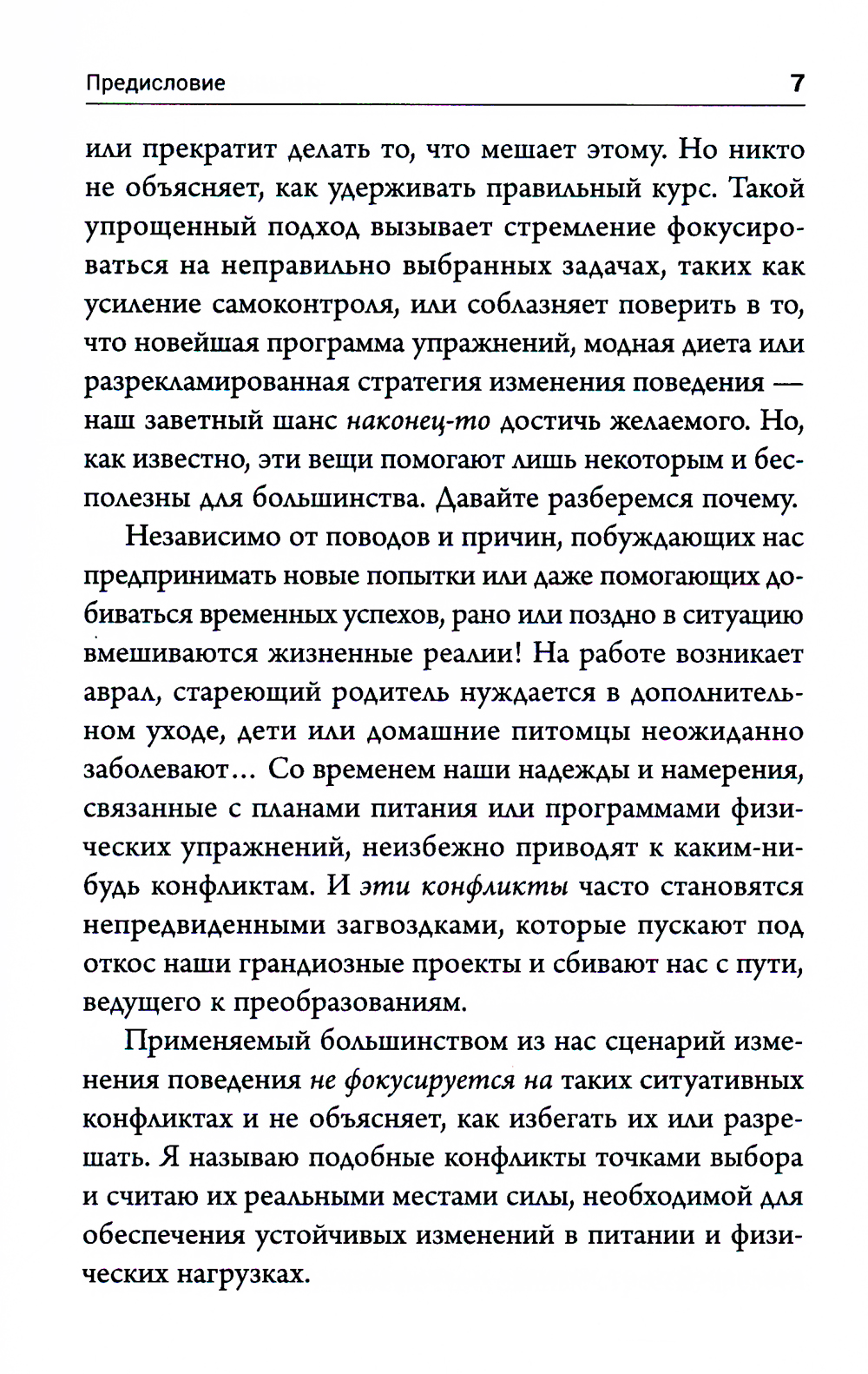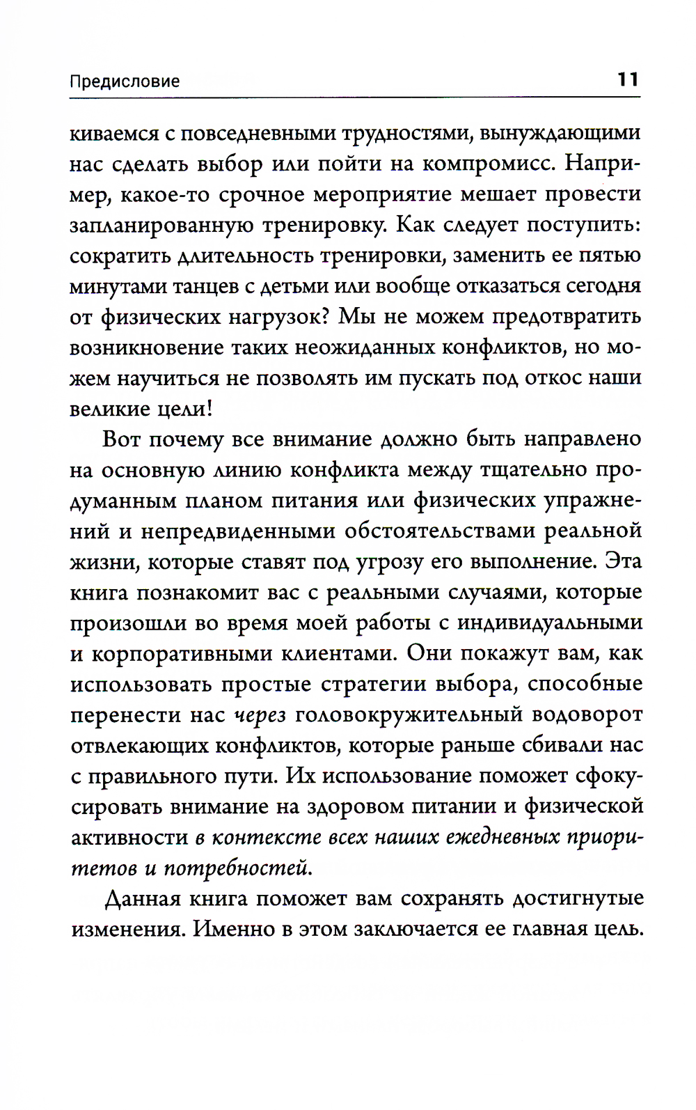 Мишель Сегар объясняет, почему стремление сбросить лишний вес часто становится помехой на пути к сохранению желаемых изменений в питании и физической активности, и показывает, каким образом трансформировать свои мысли, чувства и намерения в пользу последовательного выбора вариантов здорового образа жизни. Читатели узнают, как обеспечить стабильность этих преобразований, и научатся реагировать на непредвиденные ситуации, не отказываясь от своих планов по ведению ЗОЖ. Данная книга написана для всех, кто стремится совместить правильное питание и занятия физическими упражнениями в повседневной жизни.