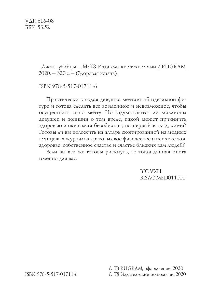 Практически каждая девушка мечтает об идеальной фигуре и готова сделать все возможное и невозможное, чтобы осуществить свою мечту. Но задумываются ли миллионы девушек и женщин о том вреде, какой может причинить здоровью даже самая безобидная, на первый взгляд, диета? Готовы ли вы положить на алтарь скопированной из модных глянцевых журналов красоты свое физическое и психическое здоровье, собственное счастье и счастье близких вам людей? Если вы все же готовы рискнуть, то тогда данная книга именно для вас.| Издательство | Т8 RUGRAM |