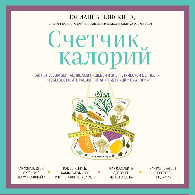 Что такое счетчик калорий? Как похудеть? Как начать правильно питаться? Все эти вопросы клиенты задают диетологам и тренерам, которые в дальнейшем обещают им идеальную фигуру. Но действительно ли их методы эффективны? Или же это будут одни сплошные ограничения? В данной книге Юлианна Плискина расскажет простым языком о белках, жирах, витаминах, минералах, составе продуктов, гликемическом индексе, Е-компонентах. Она поможет вам определить тип фигуры и суточную норму калорий, научит составлять рацион питания и даст рекомендации по выбору качественных продуктов. Это книга для тех, кто устал сидеть на изнурительных диетах и хочет сделать первый шаг на пути к правильному питанию и похудению. Об авторе: Юлианна Плискина - wellbeing эксперт, телеведущая, автор книг о здоровом образе жизни, блогер (pliskina_health), президент Фонда социальных программ «Будущее поколение страны», входит в ТОП-20 спикеров России (портал «Национальные интересы», газета «Metro»). Преимущества книги: - первый в России справочник с таблицами калорийности, в которых учитывается полный витаминный и минеральный состав продуктов, помимо их пищевой и энергетической ценности; - все продукты разделены на группы в алфавитном порядке; - личный «Дневник Здоровья». «Эта книга настоящий must-have для всех, кто придерживается правильного питания и здорового образа жизни. В ней есть все самое необходимое: таблицы пищевой ценности самых разнообразных продуктов, советы по выбору качественных продуктов в магазине, как выявить у себя недостаток тех или иных витаминов в рационе. Но самое ценное - книга помогает составить систему питания, подходящую именно вам! Очень понравился последний раздел книги - "Мой дневник питания", в котором можно поставить себе цели и день за днем и шаг за шагом двигаться к достижению идеального результата. Можно записывать графики и планы тренировок, а также свое меню на неделю или на день». - Отзыв читателя Shalimar на Лабиринт| Издательство | ООО "Издательство "Эксмо" |