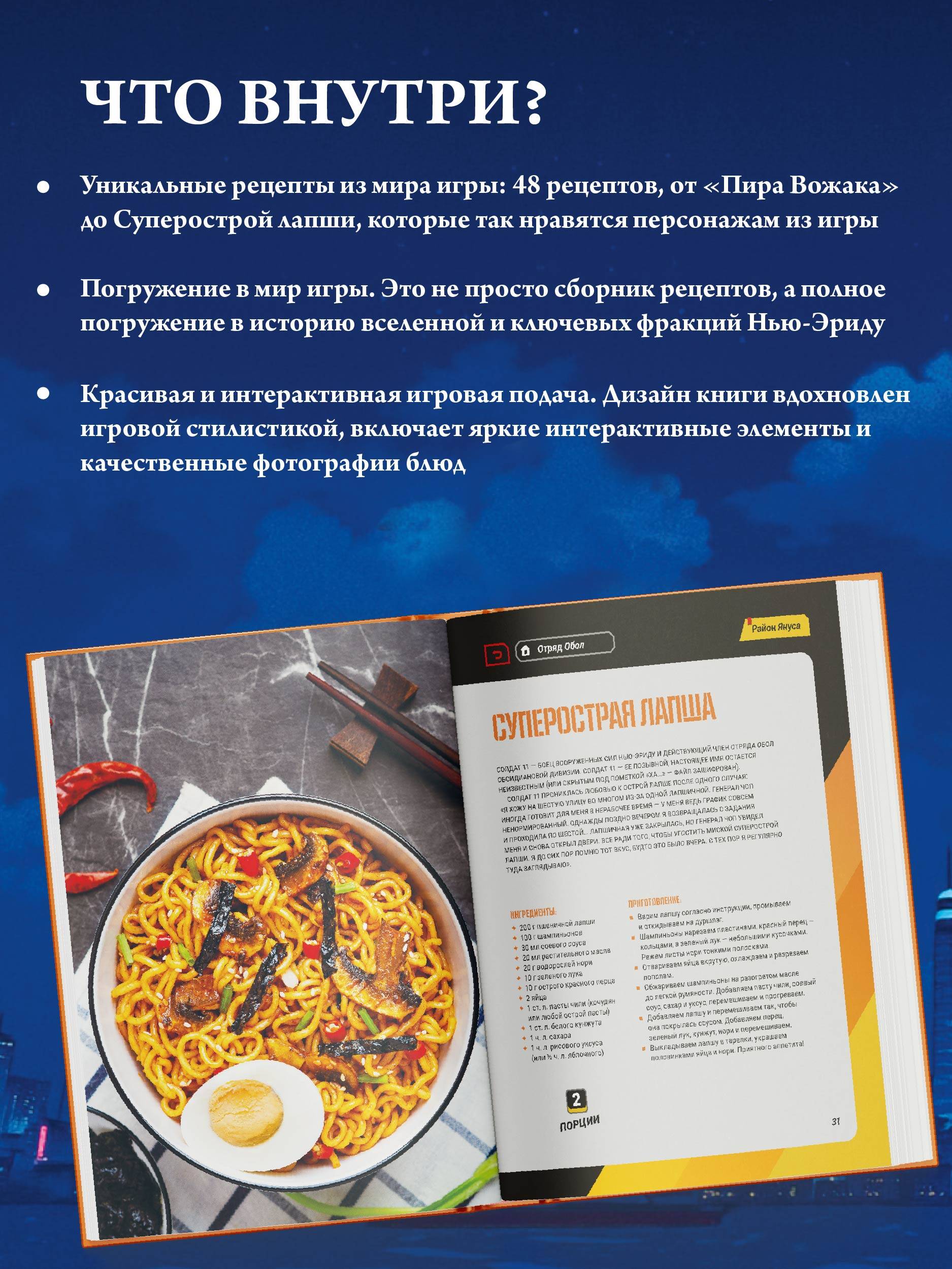 Добро пожаловать в Нью-Эриду! Давайте заглянем в видеопрокат Random Play - место, где каждая кассета открывает новую историю. Отправляйтесь в кулинарное путешествие вместе с Вайз и Белль, а также их верным шеф-поваром банбу. На страницах книги вы встретите множество рецептов и откроете для себя капельку интересных историй регионов, где люди научились превращать опасность в силу и вкус. Попробуйте: • "Пир Вожака", одно из фирменных блюд "Сырополиса" на Объездой. • Баоцзы - любимое блюдо из детства Исюань. • Суперострую лапшу - единственный и неизменный ужин Солдата 11. • Клубничное парфе - такой же необычный десерт, как и ник Йидхари. Вставляйте кассету, выбирайте рецепт - и создавайте собственный кулинарный блокбастер у себя на кухне!