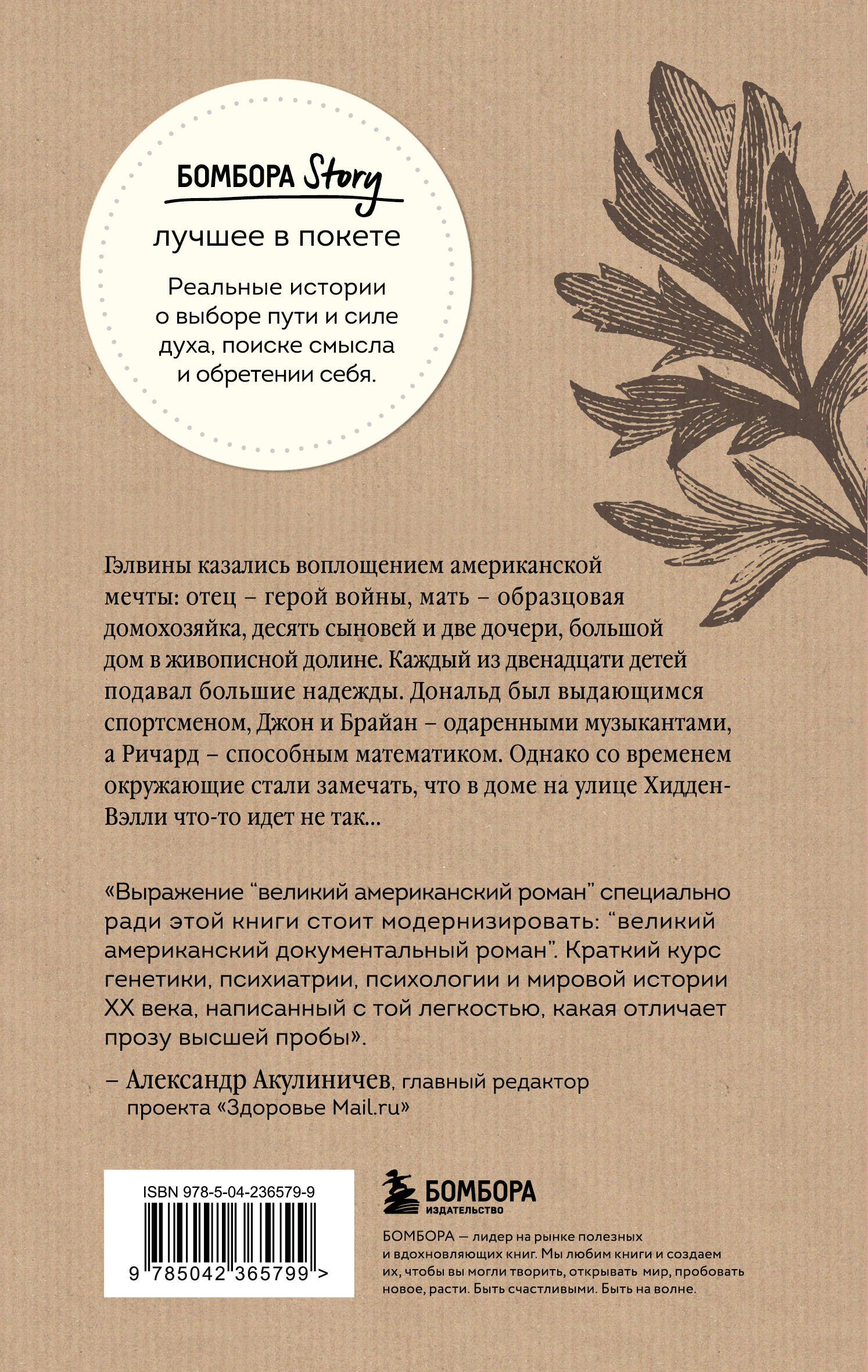 В РОССИИ ПРОДАНО БОЛЕЕ 121 000 экз. БОЛЕЕ 21 000 отзывов НА AMAZON. Лучшая книга 2020 года по версии THE NEW YORK TIMES, WALL STREET JOURNAL, THE WASHINGTON POST, NATIONAL PUBLIC RADIO, AMAZON, TIME, PEOPLE, COSMOPOLITAN И THE NEW YORK POST. Гэлвины казались воплощением американской мечты: отец - герой войны, мать - образцовая домохозяйка, десять сыновей и две дочери, большой дом в живописной долине. Каждый из двенадцати детей подавал большие надежды. Дональд был выдающимся спортсменом, Джон и Брайан - одаренными музыкантами, а Ричард - способным математиком. Однако со временем окружающие стали замечать, что в доме на улице Хидден-Вэлли что-то идет не так… Семья Гэлвинов хранила тайну, но их скелеты в шкафу стали достоянием всего мира и главной научной загадкой XX века, над которой десятилетиями бились генетики и психиатры. А за кадром многолетних исследований разыгрывалась настоящая трагедия: абьюз, сексуальное насилие, наркотики и даже убийство. Быть Гэлвином означало либо сходить с ума самому, либо наблюдать, как это делают близкие. Блестящее расследование Роберта Колкера - невероятная история одной семьи, подарившей надежду на исцеление миллионам людей.| Издательство | ООО "Издательство "Эксмо" |