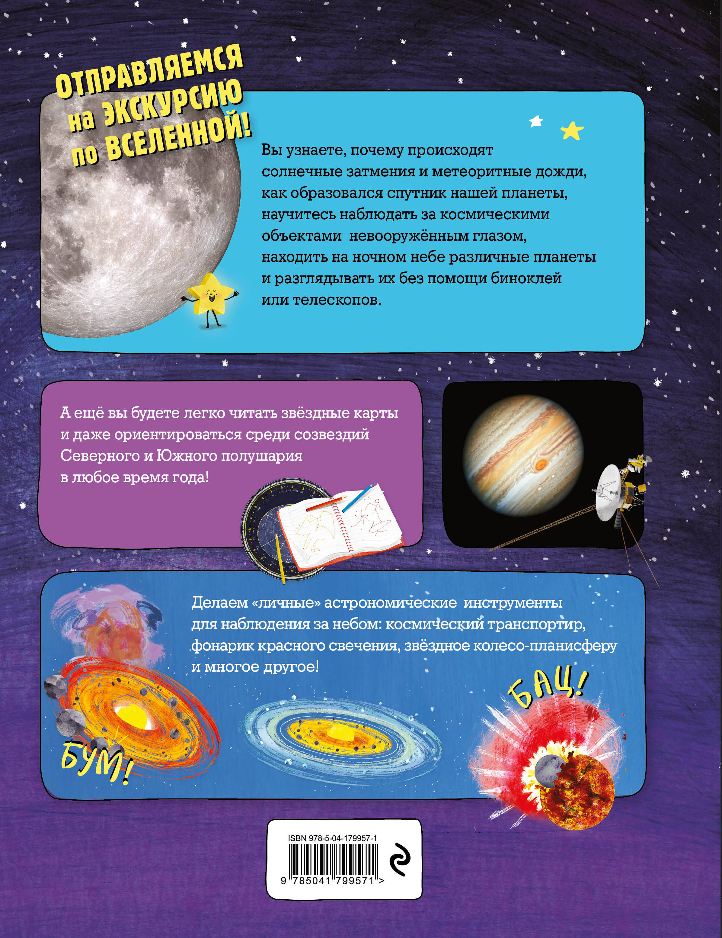 Это невероятно красочное издание входит в ТОП-100 лучших в мире книг по астрономии рейтинга Amazon. Оно посвящено одной из самых захватывающих тем - нашей Вселенной. А ещё у энциклопедии есть удивительный секрет: она светится в темноте! Читатели узнают, как образовались разные небесные тела, в чём секрет природных явлений, наблюдаемых в небе, как находить невооружённым глазом различные созвездия и планеты и многое другое. Карты небесных полушарий и сделанные своими руками астрономические инструменты помогут каждому мастерски ориентироваться в самых загадочных уголках звёздного неба! А разглядеть объекты Солнечной системе во всей их красе позволят большие и яркие фотографии. Книга будет интересна и полезна как школьникам, так и взрослым любителям космоса. Она отлично подходит для изучения всей семьёй и послужит идеальным подарком по любому поводу!