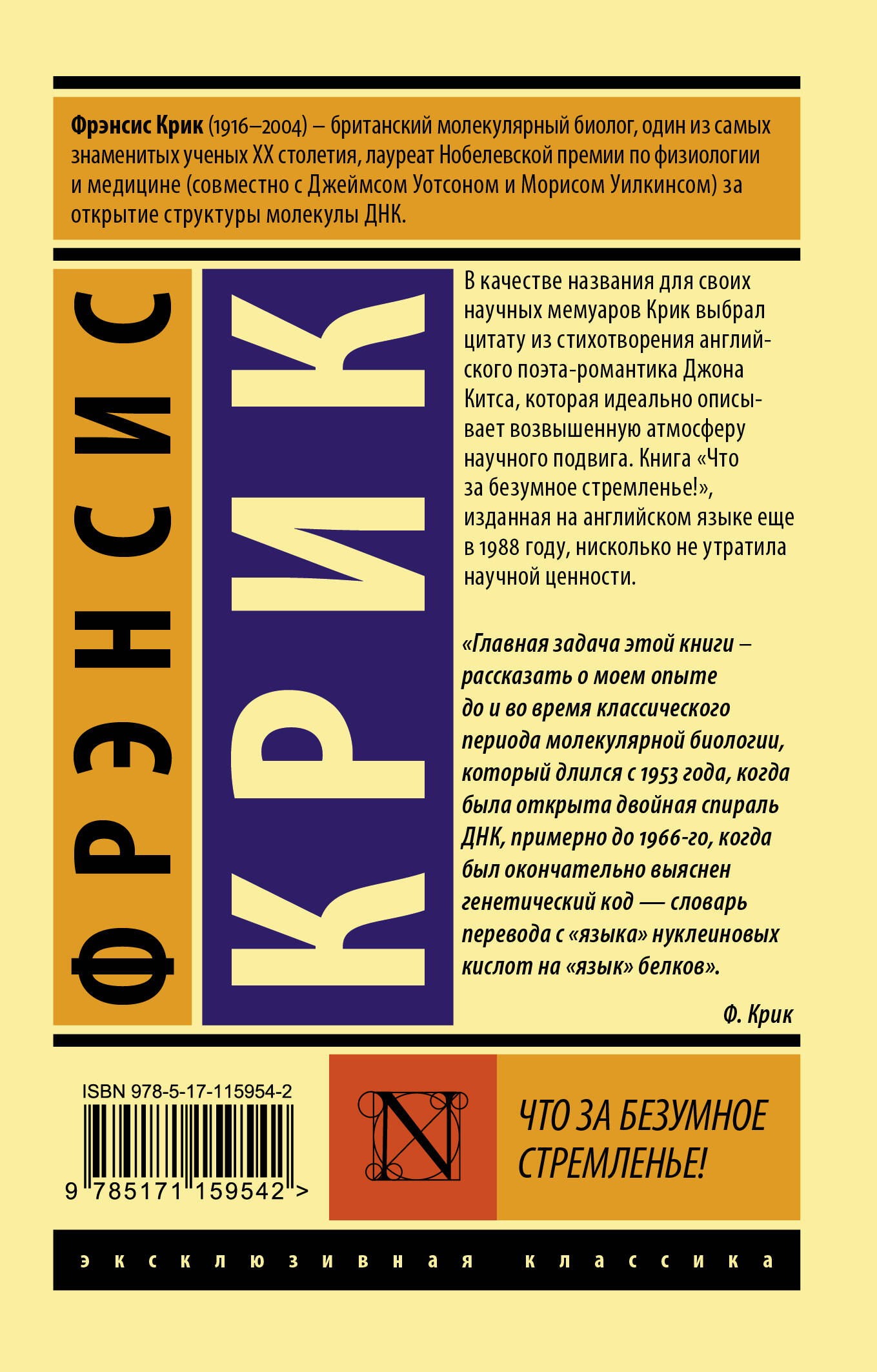 Фрэнсис Крик (1916-2004) - британский молекулярный биолог, один из самых знаменитых ученых XX столетия, лауреат Нобелевской премии по физиологии и медицине (совместно с Джеймсом Уотсоном и Морисом Уилкинсом) за открытие структуры молекулы ДНК. В качестве названия для своих научных мемуаров Крик выбрал цитату из стихотворения английского поэта-романтика Джона Китса, которая идеально описывает возвышенную атмосферу научного подвига. Книга "Что за безумное стремленье!", изданная по-английски еще в 1988 году, выходит по-русски в новом переводе.| Издательство | ИЗДАТЕЛЬСТВО "АСТ" |
