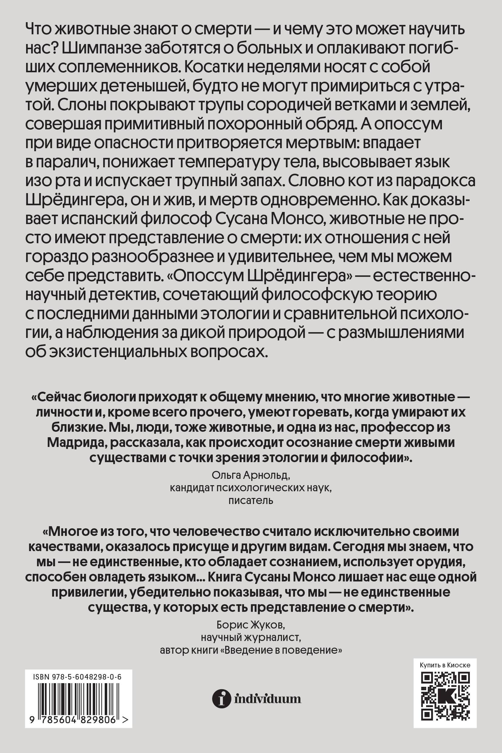 Что животные знают о смерти - и чему это может научить нас? Шимпанзе заботятся о больных и оплакивают погибших соплеменников. Косатки неделями носят с собой умерших детенышей, будто не могут примириться с утратой. Слоны покрывают трупы сородичей ветками и землей, совершая примитивный похоронный обряд. А опоссум при виде опасности притворяется мертвым: впадает в паралич, понижает температуру тела, высовывает язык изо рта и испускает трупный запах. Словно кот из парадокса Шрёдингера, он и жив, и мертв одновременно. Как доказывает испанский философ Сусана Монсо, животные не просто имеют представление о смерти: их отношения с ней гораздо разнообразнее и удивительнее, чем мы можем себе представить. «Опоссум Шрёдингера» - естественно-научный детектив, сочетающий философскую теорию с последними данными этологии и сравнительной психологии, а наблюдения за дикой природой - с размышлениями об экзистенциальных вопросах.| Издательство | ИНДИВИДУУМ ПРИНТ ООО |