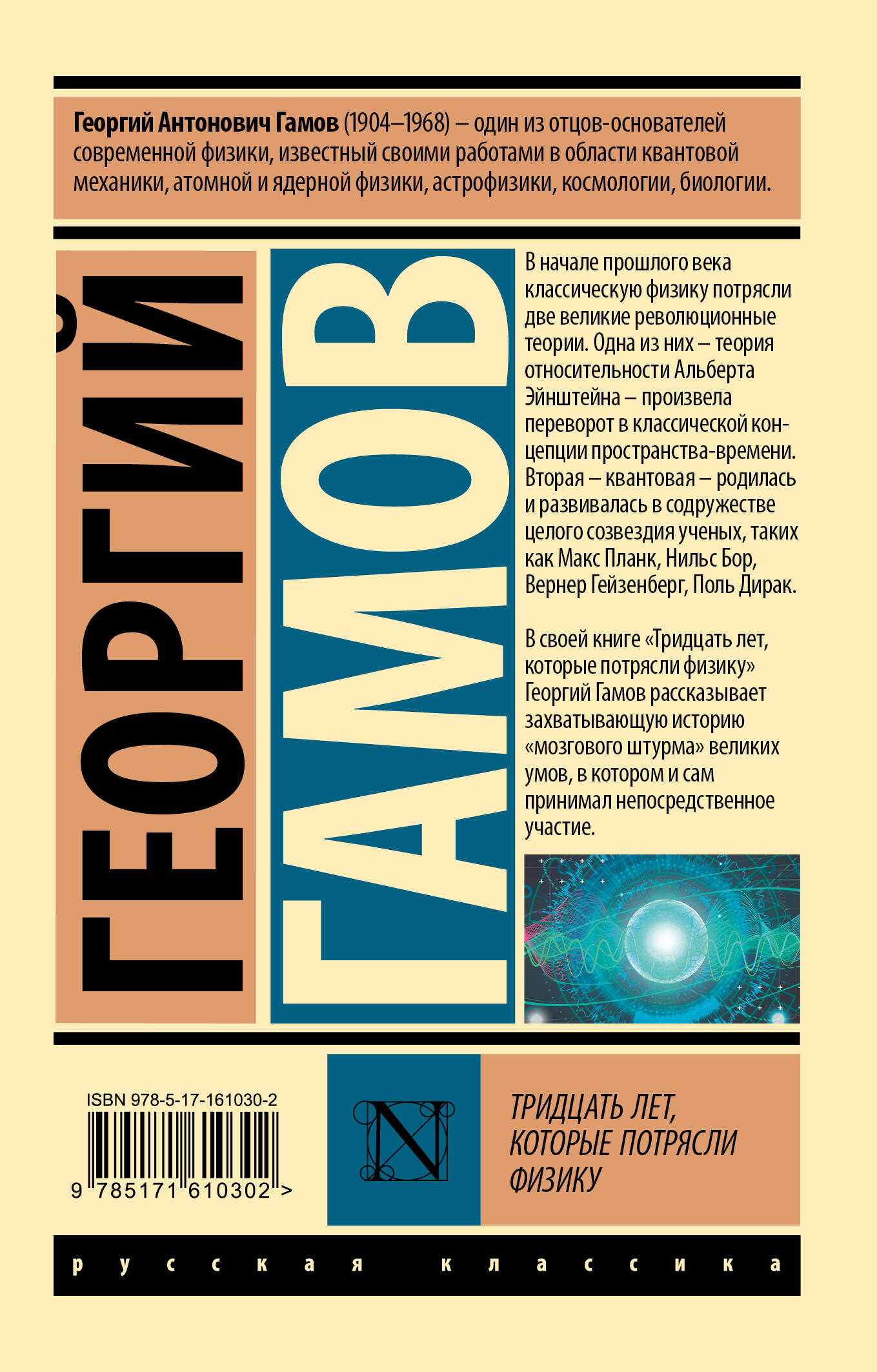 В начале прошлого века классическую физику потрясли две великие революционные теории. Одна из них - теория относительности Альберта Эйнштейна -- произвела переворот в классической концепции пространства-времени. Вторая -- квантовая -- родилась и развивалась в содружестве целого созвездия ученых, таких как Макс Планк, Нильс Бор, Вернер Гейзенберг, Поль Дирак. В своей книге "Тридцать лет, которые потрясли физику" Георгий Гамов рассказывает захватывающую историю "мозгового штурма" великих умов, в котором и сам принимал непосредственное участие.| Издательство | ИЗДАТЕЛЬСТВО "АСТ" |