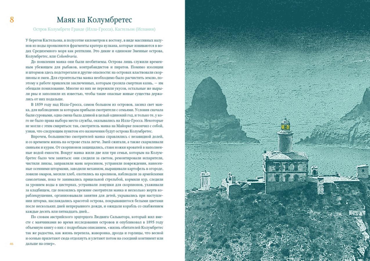 В этом необычном путешествии к самым отдаленным маякам на планете вы познакомитесь не только с особенностями их архитектуры, внутреннего устройства и технического оснащения, но и со множеством увлекательных историй, связанных со строительством маяков и с их смотрителями, с кораблекрушениями и с мистическими происшествиями. Это и рассказ о слепом смотрителе маяка за полярным кругом, о пришедшей на помощь терпящим бедствие морякам бесстрашной девушке, о призраке мичмана, являющемся на маяк каждую ночь и выстукивающем на пишущей машинке некое предостережение, о странном человеке, который предпочел укрыться от всех в башне в открытом море… В этих историях сходятся мотивы и творческие горизонты Жюля Верна, Эдгара Аллана По, Вирджинии Вулф, проведшей детство на маяке, Редьярда Киплинга, Рэя Брэдбери и других великих писателей, стремившихся поведать миру об одиночестве, о тревоге, о храбрости и счастье. Текст сопровождают великолепные иллюстрации, морские карты и масштабные планы с указанием точных координат маяков и их технических характеристик - дается схема каждого маяка в разрезе, его точные координаты и параметры светового сигнала, назван инженер, время строительства и введения в эксплуатацию, указано, функционирует ли маяк сейчас или заброшен, какова высота его башни, высота огня над уровнем моря, дальность видимости огня, а также приводятся многие другие интересные сведения. «Перед вами не просто книга о маяках. Это способ познать нас самих, отраженных в зеркале человеческой природы, задаться вопросом, способны ли мы жить в одиночестве и насколько мы зависим друг от друга в борьбе за выживание». (Хосе Луис Гонсалес Масиас)| Издательство | КоЛибри |
