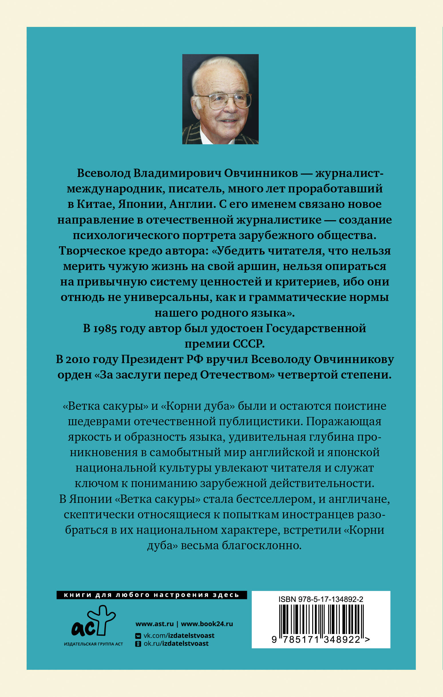 Всеволод Владимирович Овчинников - журналист-международник, писатель, много лет проработавший в Китае, Японии, Англии. С его именем связано новое направление в отечественной журналистике - создание психологического портрета зарубежного общества. Творческое кредо автора: "Убедить читателя, что нельзя мерить чужую жизнь на свой аршин, нельзя опираться на привычную систему ценностей и критериев, ибо они отнюдь не универсальны, как и грамматические нормы нашего родного языка". В 1985 году за эти произведения автор был удостоен Государственной премии СССР. В 2010 году Президент РФ вручил Всеволоду Овчинникову орден "За заслуги перед Отечеством" четвертой степени. "Ветка сакуры" и "Корни дуба" - были и остаются поистине шедевром отечественной публицистики. Поражающая яркость и образность языка, удивительная глубина проникновения в самобытный мир английской и японской национальной культуры увлекают читателя и служат ключом к пониманию зарубежной действительности. В Японии "Ветка сакуры" стала бестселлером, и англичане, скептически относящиеся к попыткам иностранцев разобраться в их национальном характере, встретили "Корни дуба" весьма благосклонно.| Издательство | ИЗДАТЕЛЬСТВО "АСТ" |