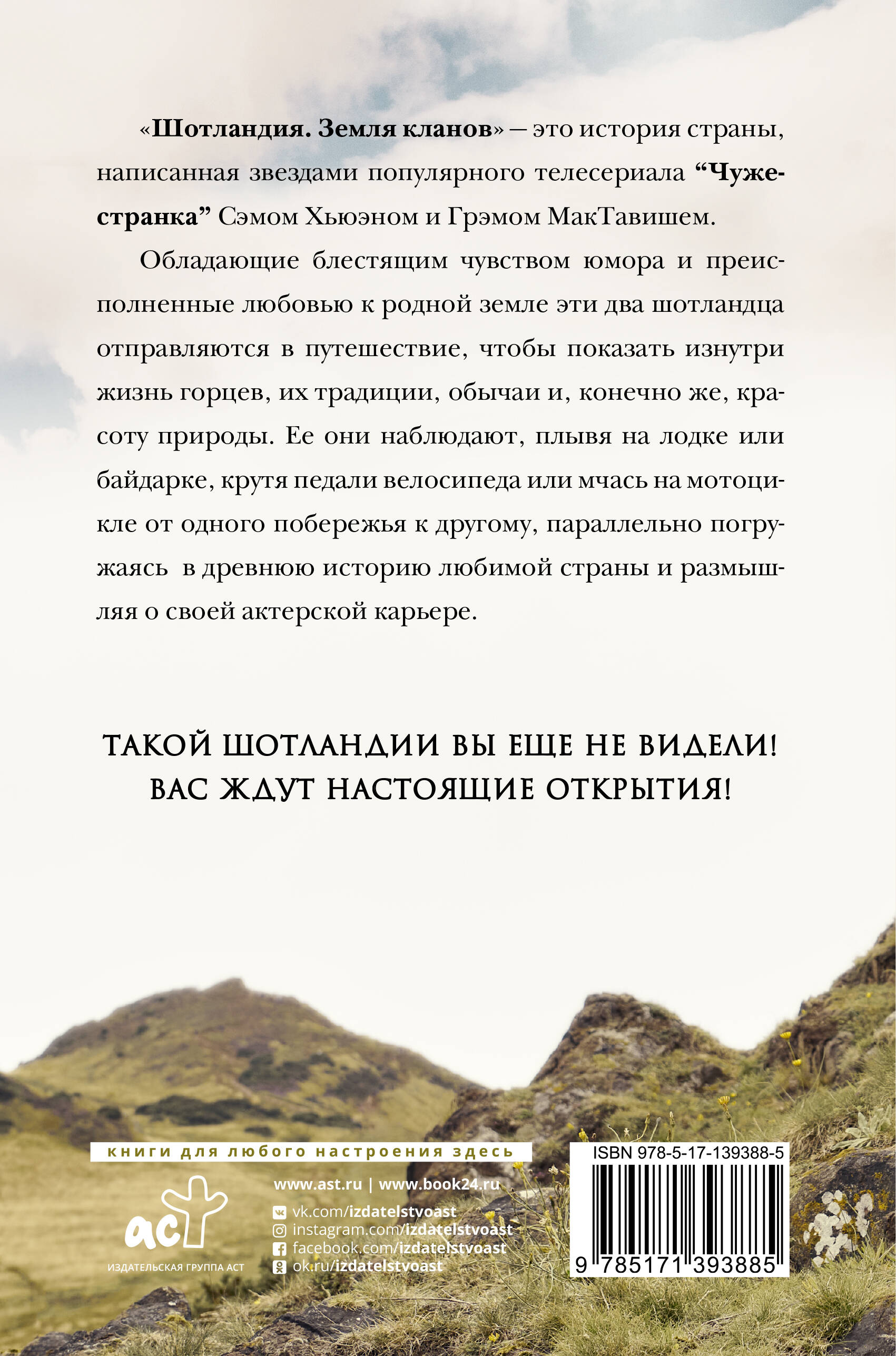 Сэм Хьюэн, шотландский актёр театра, кино и телевидения ("Чисто английские убийства", "Чужестранка", "Шпион, который меня кинул", "Бладшот"). Грэм Мактавиш, шотландский актёр (Трилогия "Хоббит", "Чужестранка", "Чисто английские убийства", "Люцифер", "Ведьмак"). "Шотландия. Земля кланов" - это история страны, написанная актерами и друзьями, Сэмом Хьюэном и Грэмом МакТавишем. Обладающие блестящим чувством юмора и преисполненные любовью к родной земле эти два шотландца отправляются в путешествие, чтобы показать изнутри жизнь горцев, их традиции, обычаи и, конечно же, красоту природы. Ее они наблюдают, плывя на лодке или байдарке, крутя педали велосипеда или мчась на мотоцикле от одного побережья к другому, параллельно погружаясь в древнюю историю любимой страны и размышляя о своей актерской карьере. В книге "Шотландия. Земля кланов" вы познакомитесь с древними традициями сурового народа, поймете, благодаря истории кланов, почему горцы считались жестокими и справедливыми, что для них были честь и достоинство, узнаете легенды и старые были. Авторы расскажут историю килта - от самого названия до его разновидностей, откроют секреты как правильно пить виски и почему именно шотландский виски, считается абсолютом во всем мире. Ну, и, конечно же, Сэм и Грэм поделятся закулисными историями со съемок популярного телесериала "Чужестранка". Такой Шотландии Вы еще не видели! Вас ждут настоящие открытия!| Издательство | АСТ |