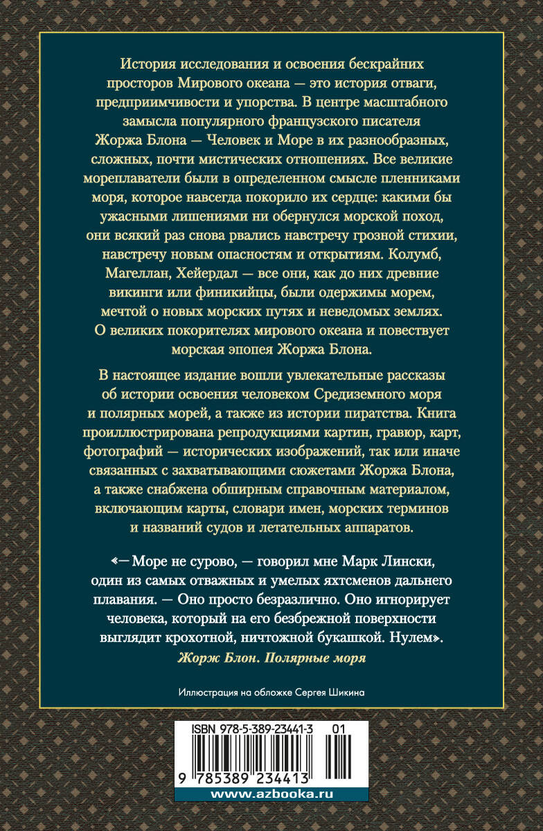 История исследования и освоения бескрайних просторов Мирового океана - это история отваги, предприимчивости и упорства. В центре масштабного замысла популярного французского писателя Жоржа Блона - Человек и Море в их разнообразных, сложных, почти мистических отношениях. Все великие мореплаватели были в определенном смысле пленниками моря, которое навсегда покорило их сердце: какими бы ужасными лишениями ни обернулся морской поход, они всякий раз снова рвались навстречу грозной стихии, навстречу новым опасностям и открытиям. Колумб, Магеллан, Хейердал - все они, как до них древние викинги или финикийцы, были одержимы морем, мечтой о новых морских путях и неведомых землях. О великих покорителях мирового океана и повествует морская эпопея Жоржа Блона. В настоящее издание вошли увлекательные рассказы об истории освоения человеком Средиземного моря и полярных морей, а также из истории пиратства. Книга проиллюстрирована репродукциями картин, гравюр, карт, фотографий - исторических изображений, так или иначе связанных с захватывающими сюжетами Жоржа Блона, а также снабжена обширным справочным материалом, включающим карты, словари имен, морских терминов и названий судов и летательных аппаратов.| Издательство | Азбука-Аттикус Издат.группа ООО |