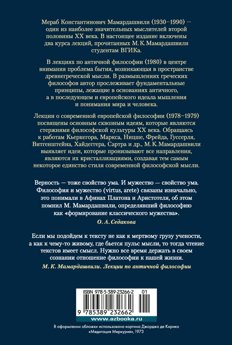 Мераб Константинович Мамардашвили (1930-1990) - один из наиболее значительных мыслителей второй половины ХХ века. В настоящее издание включены два курса лекций, прочитанных М. К. Мамардашвили студентам ВГИКа. В лекциях по античной философии (1980) в центре внимания проблема бытия, возникающая в пространстве древнегреческой мысли. В размышлениях греческих философов автор прослеживает фундаментальные принципы, лежащие в основаниях античного, а в последующем и европейского идеала мышления и понимания мира и человека. Лекции о современной европейской философии (1978-1979) посвящены основным сквозным идеям, которые являются стержнями философской культуры ХХ века. Обращаясь к работам Кьеркегора, Маркса, Ницше, Фрейда, Гуссерля, Витгенштейна, Хайдеггера, Сартра и др., М. К. Мамардашвили выявляет идеи, которые пронизывают все направления, являются их кристаллизациями, создавая тем самым некоторое единство стиля современной философской мысли.| Издательство | Азбука-Аттикус Издат.группа ООО |