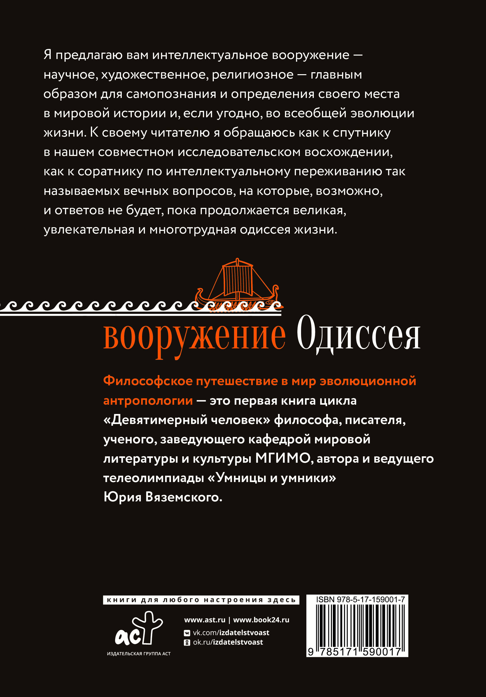 Философское путешествие в мир эволюционной антропологии - первая книга цикла "Девятимерный человек" философа, писателя, ученого, заведующего кафедрой мировой литературы и культуры МГИМО, автора и ведущего телеолимпиады "Умницы и умники" Юрия Вяземского. Увлекательное интеллектуальное чтение. Вслед за Одиссеем автор поведет читателя по пути познания мира через религию, науку, искусство. Описание оригинальной антропологической системы, призванной помочь нам найти свои ответы на многие философские вопросы.| Издательство | Издательство "АСТ" |