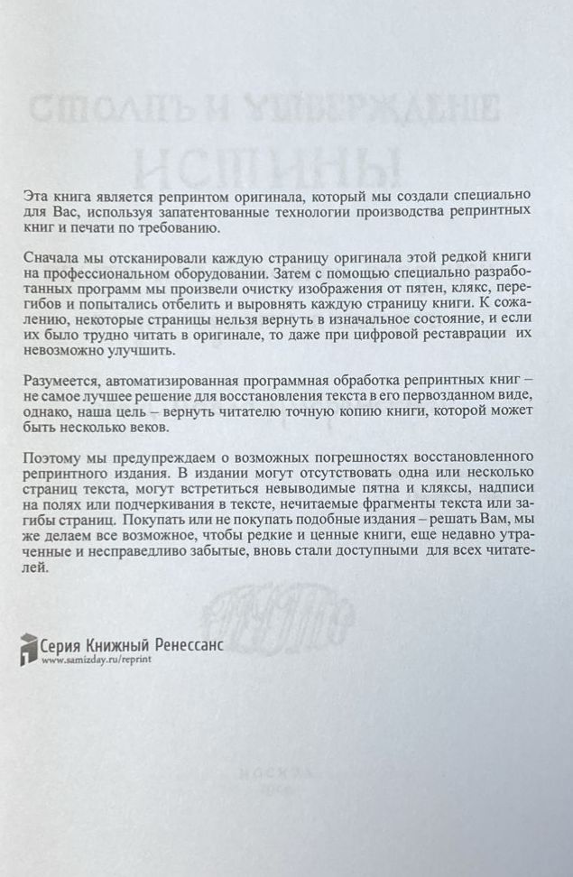 Печатная книга «Столп и утверждение истины» в мягкой обложке, язык - русский. В книге 820 страниц, она напечатана на белой офсетной бумаге плотностью 80 г/м². Формат издания - 148x210 мм.