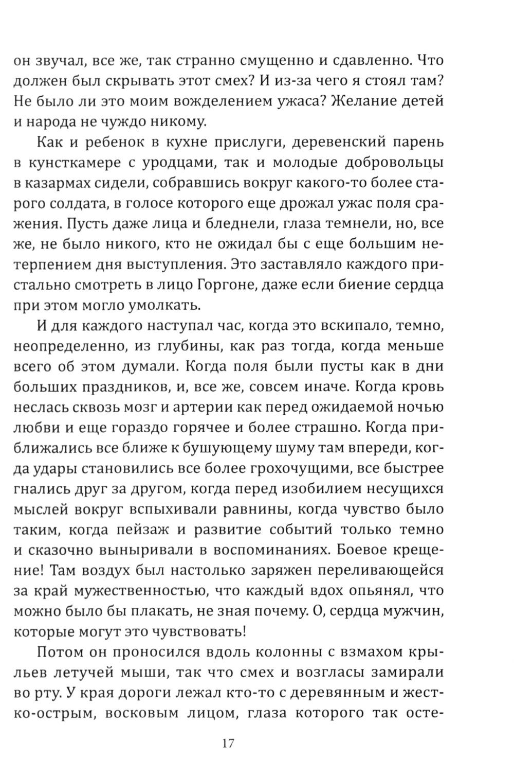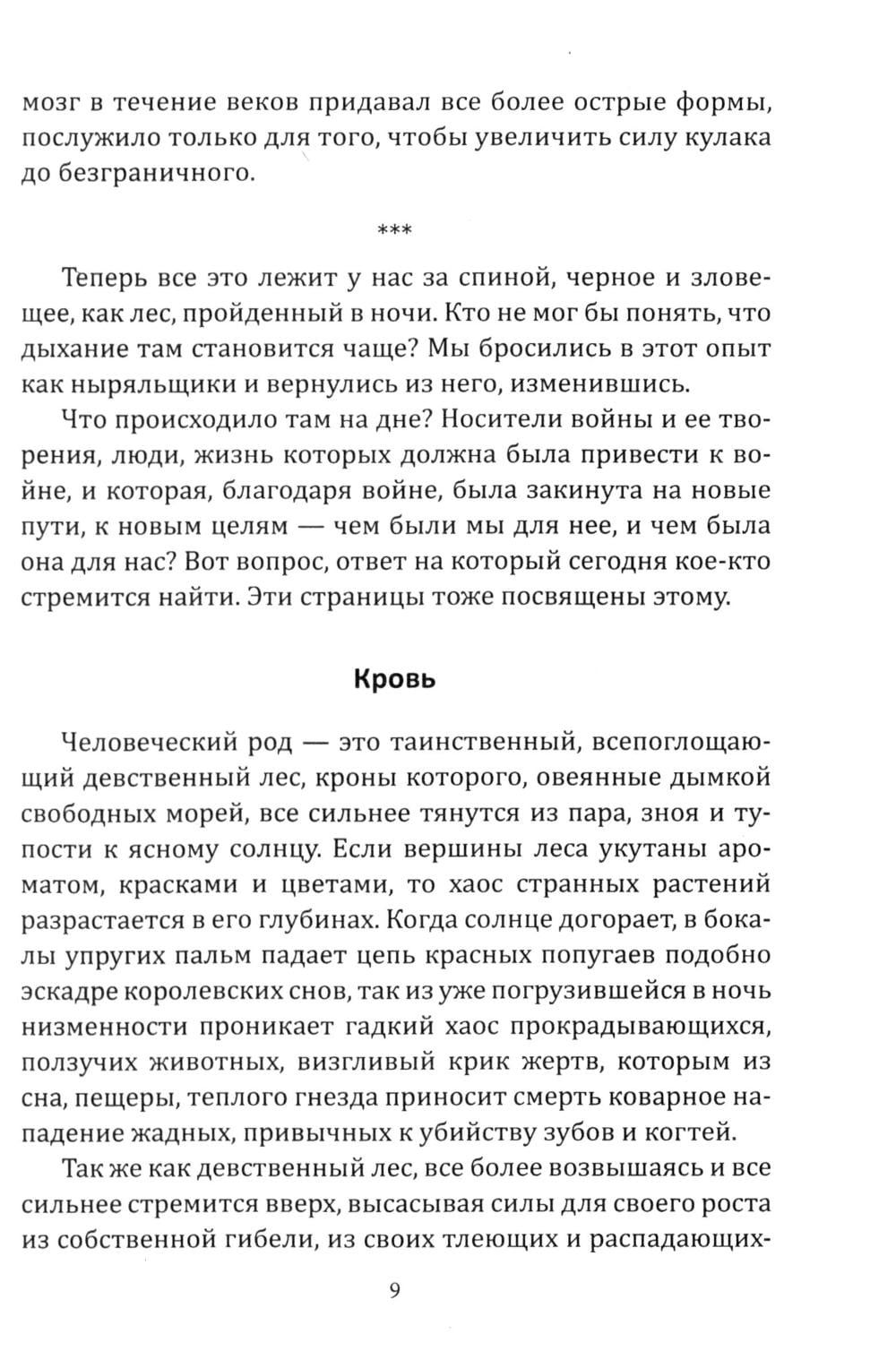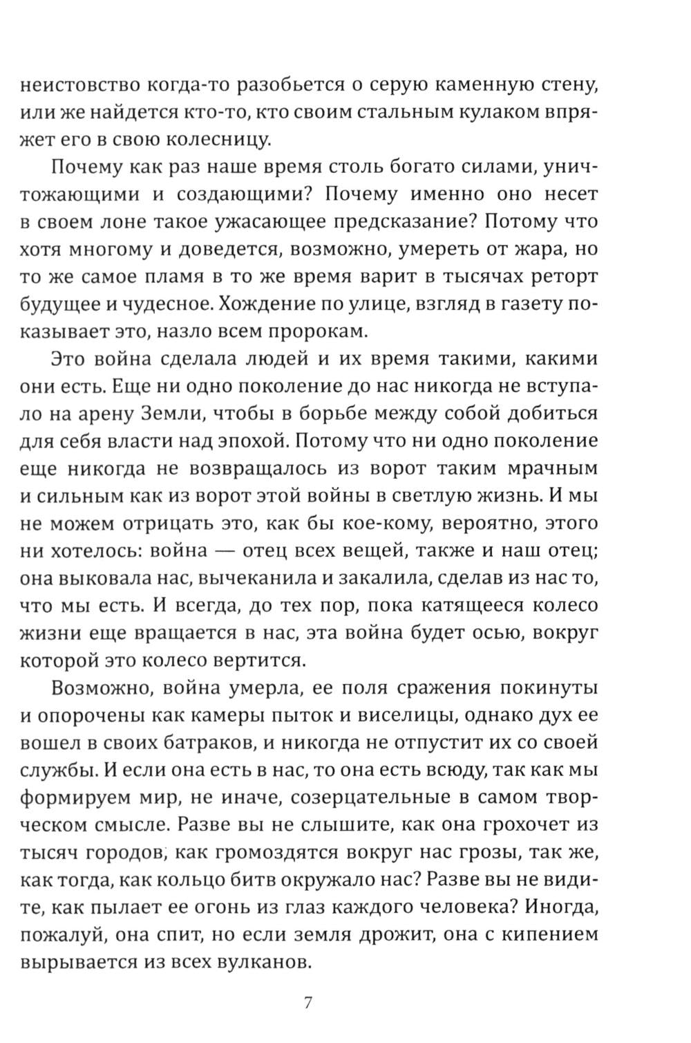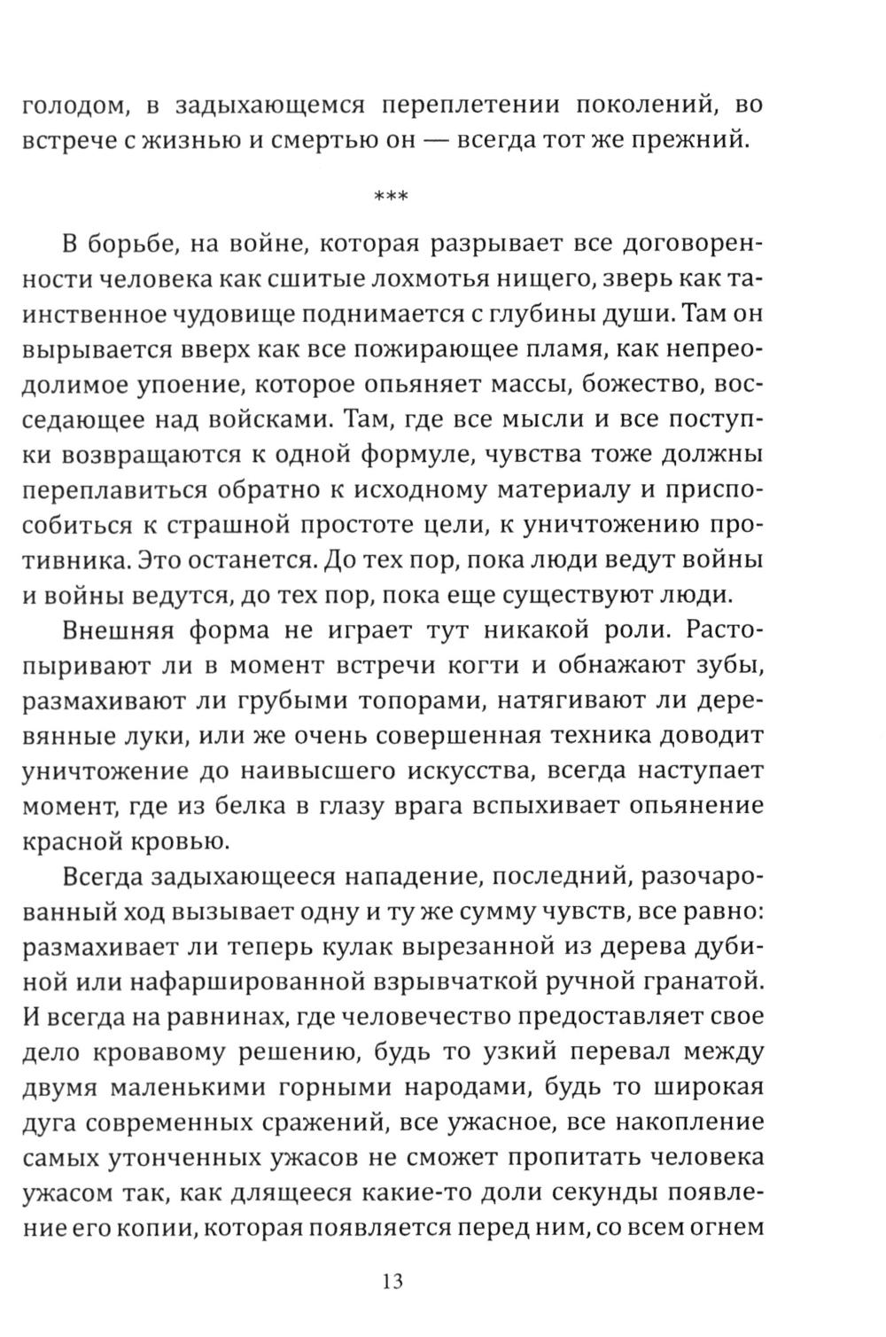 «До тех пор, пока колесо жизни вращается, война будет осью, вокруг которой это колесо вертится, - пишет Эрнст Юнгер (1895 - 1998), немецкий мыслитель и писатель, который сам прошел две мировые войны. - Война не только наш отец, но также и наш сын. Мы породили ее, а она нас. Разве вы не видите, как пылает ее огонь из глаз каждого человека?». В своих заметках, эссе, а также в воспоминаниях о войне он осмысливает войну как один из важнейших феноменов бытия, уделяя большое внимание запредельному состоянию человеческого «Я» перед лицом смерти. Роже Кайуа (1913 - 1978), французский писатель, философ и социолог, дает иную философскую оценку войны, в чем-то похожую на понятие «коллективного бессознательного» Карла Юнга. Пробуждаемые войной глубинные слои подсознания вызывают насилие, страх, злобу, ненависть, жажду мести, что придает войне некую мистическую силу.| Издательство | Родина |