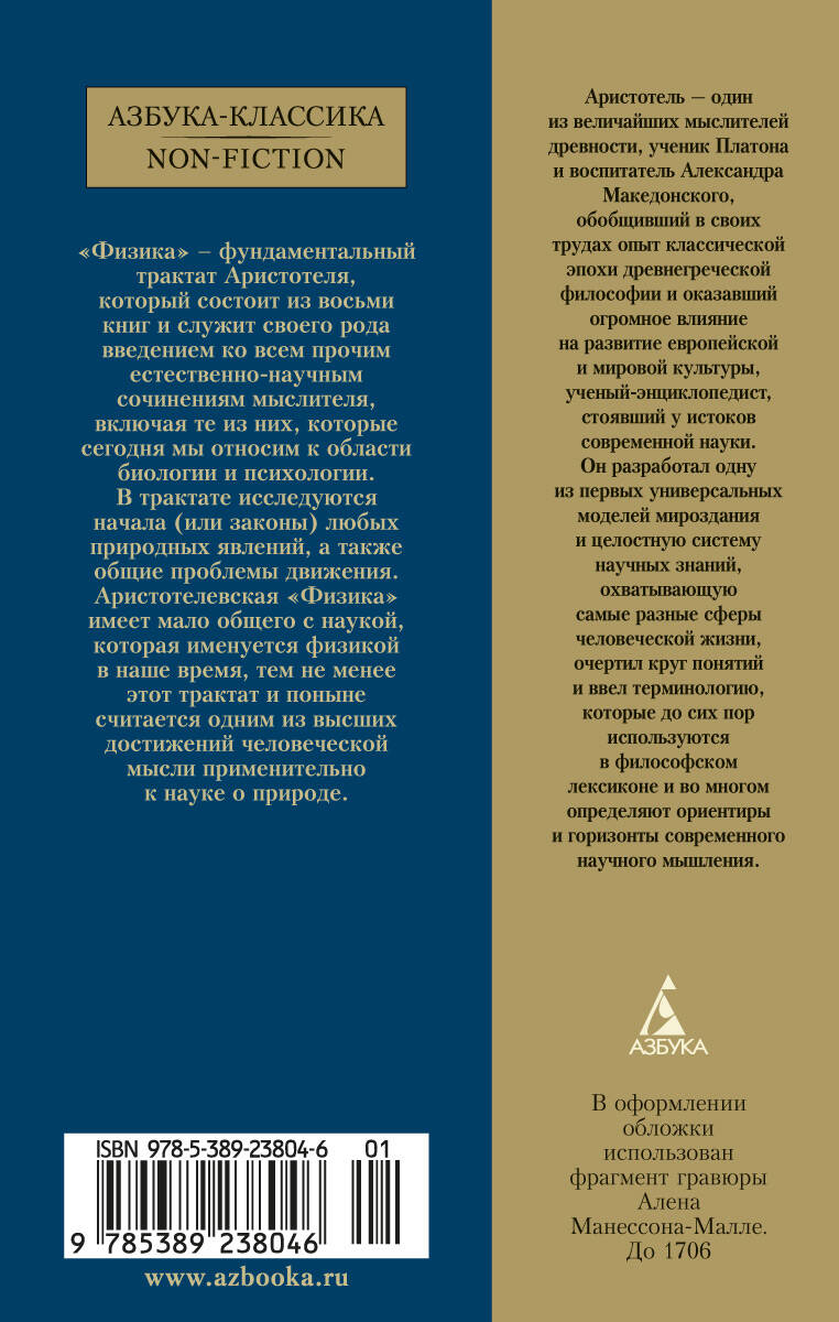 Аристотель - один из величайших мыслителей древности, ученик Платона и воспитатель Александра Македонского, обобщивший в своих трудах опыт классической эпохи древнегреческой философии и оказавший огромное влияние на развитие европейской и мировой культуры, ученый-энциклопедист, стоявший у истоков современной науки. Он разработал одну из первых универсальных моделей мироздания и целостную систему научных знаний, охватывающую самые разные сферы человеческой жизни, очертил круг понятий и ввел терминологию, которые до сих пор используются в философском лексиконе и во многом определяют ориентиры и горизонты современного научного мышления. "Физика" - фундаментальный трактат Аристотеля, который состоит из восьми книг и служит своего рода введением ко всем прочим естественно-научным сочинениям мыслителя, включая те из них, которые сегодня мы относим к области биологии и психологии. В трактате исследуются начала (или законы) любых природных явлений, а также общие проблемы движения. Аристотелевская "Физика" имеет мало общего с наукой, которая именуется физикой в наше время, тем не менее этот трактат и поныне считается одним из высших достижений человеческой мысли применительно к науке о природе.| Издательство | Азбука-Аттикус Издат.группа ООО |