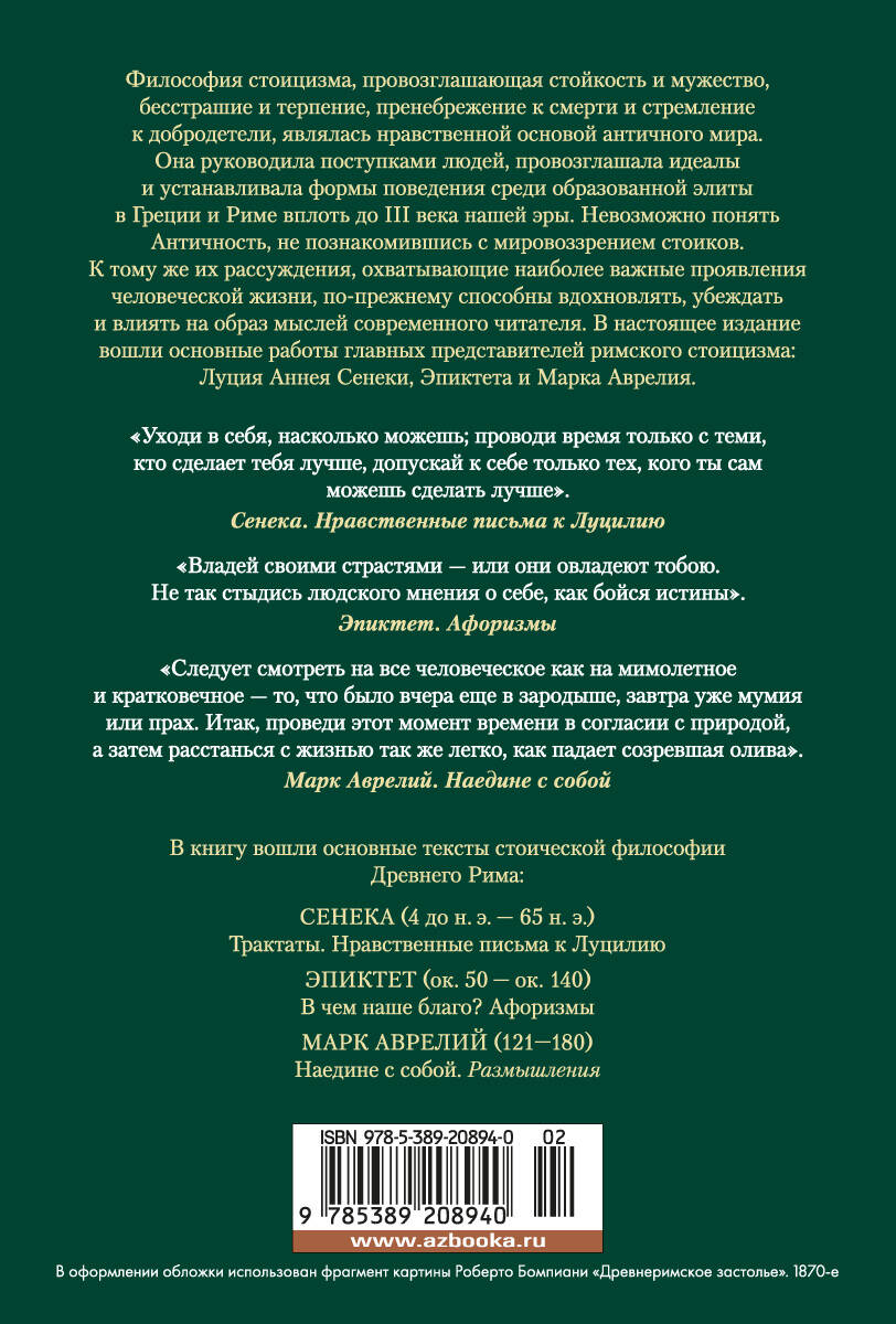 Философия стоицизма, провозглашающая стойкость и мужество, бесстрашие и терпение, пренебрежение к смерти и стремление к добродетели, являлась нравственной основой античного мира. Она руководила поступками людей, провозглашала идеалы и устанавливала формы поведения среди образованной элиты в Греции и Риме вплоть до III века нашей эры. Невозможно понять Античность, не познакомившись с мировоззрением стоиков. К тому же их рассуждения, охватывающие наиболее важные проявления человеческой жизни, по-прежнему способны вдохновлять, убеждать и влиять на образ мыслей современного читателя. В настоящее издание вошли основные работы главных представителей римского стоицизма: Луция Аннея Сенеки, Эпиктета и Марка Аврелия.| Издательство | Азбука-Аттикус Издат.группа ООО |
