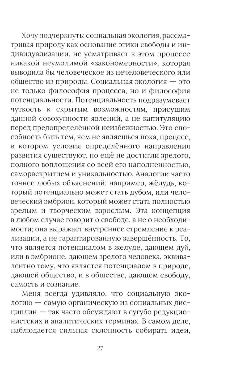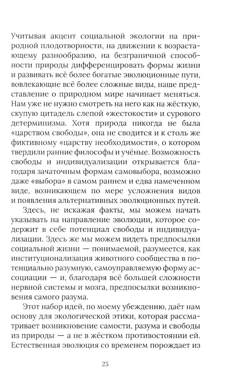 Мюррей Букчин (1921-2006) - один из классиков американской либертарной и анархической мысли, основоположник «радикального муниципализма», один из основателей современного экологического («зелёного») движения. Идейный вдохновитель Абдуллы Оджалана. В этой книге (впервые издана в 1986 году) Букчин разбирает, как техногенная цивилизация, государство и капитализм разрушают природу и лишают человека не только свободы, но и права быть личностью. Книга стала манифестом экологизма восьмидесятых и оказала огромное влияние на анархизм.