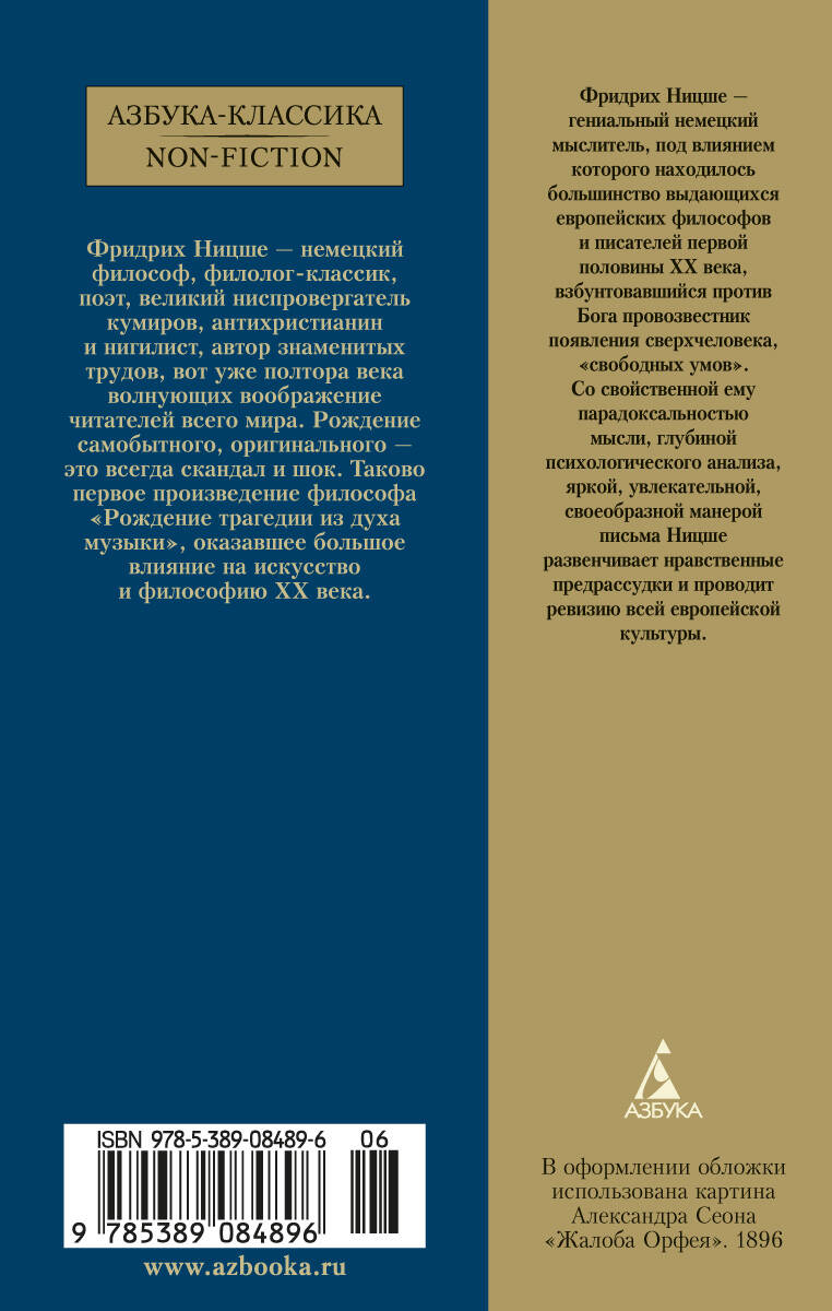 Фридрих Ницше - немецкий философ, филолог-классик, поэт, великий ниспровергатель кумиров, антихристианин и нигилист, автор знаменитых трудов, вот уже полтора века волнующих воображение читателей всего мира. Рождение самобытного, оригинального - это всегда скандал и шок. Таково первое произведение философа "Рождение трагедии из духа музыки", оказавшее большое влияние на искусство и философию ХХ века.