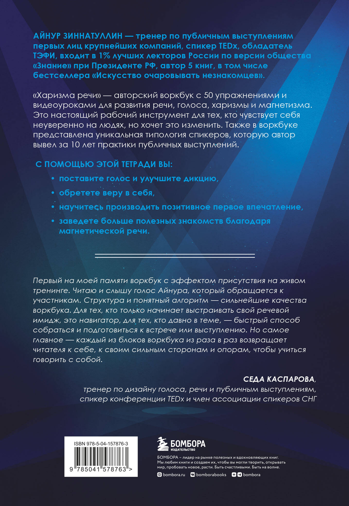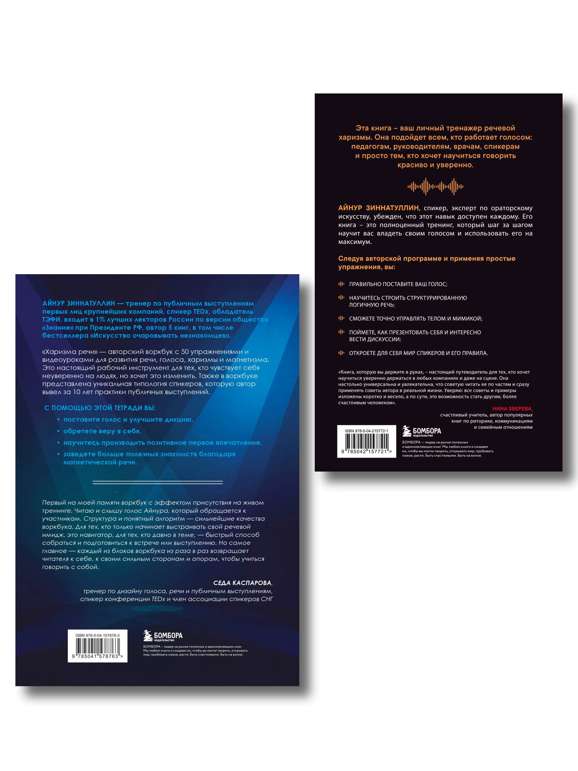 Комплект из книги и воркбука Айнура Зиннатуллина, спикера и эксперта по ораторскому искусству "Харизма голоса" - это книга-тренинг для тех, кто хочет говорить уверенно, выразительно и производить сильное впечатление. Простые упражнения и техники помогут настроить голос, улучшить дикцию, управлять мимикой и телом, а также побороть страх перед аудиторией. Ваш голос станет главным инструментом успеха и влияния. "Харизма речи" - авторский воркбук с 50 упражнениями и видеоуроками для развития речи, голоса, харизмы и магнетизма. Это настоящий рабочий инструмент для тех, кто чувствует себя неуверенно на людях, но хочет это изменить. Также в воркбуке представлена уникальная типология спикеров, которую автор вывел за 10 лет практики публичных выступлений.| Издательство | ООО "Издательство "Эксмо" |