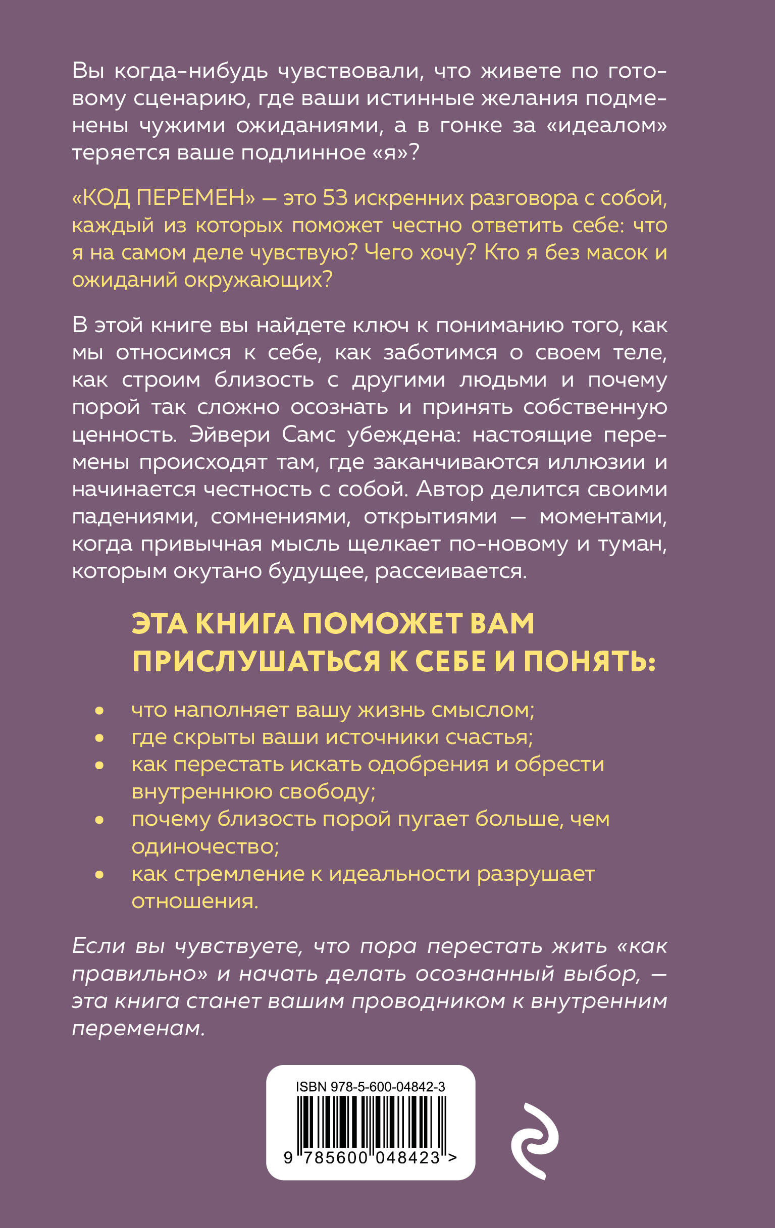 Вы когда-нибудь чувствовали, что живете по готовому сценарию, где ваши истинные желания подменены чужими ожиданиями, а в гонке за «идеалом» теряется ваше подлинное «я»? «КОД ПЕРЕМЕН» - это 53 искренних разговора с собой, каждый из которых поможет честно ответить себе: что я на самом деле чувствую? Чего хочу? Кто я без масок и ожиданий окружающих? В этой книге вы найдете ключ к пониманию того, как мы относимся к себе, как заботимся о своем теле, как строим близость с другими людьми и почему порой так сложно осознать и принять собственную ценность. Эйвери Самс убеждена: настоящие перемены происходят там, где заканчиваются иллюзии и начинается честность с собой. Автор делится своими падениями, сомнениями, открытиями - моментами, когда привычная мысль щелкает по-новому и туман, которым окутано будущее, рассеивается. ЭТА КНИГА ПОМОЖЕТ ВАМ ПРИСЛУШАТЬСЯ К СЕБЕ И ПОНЯТЬ: что наполняет вашу жизнь смыслом; где скрыты ваши источники счастья; как перестать искать одобрения и обрести внутреннюю свободу; почему близость порой пугает больше, чем одиночество; как стремление к идеальности разрушает отношения. Если вы чувствуете, что пора перестать жить «как правильно» и начать делать осознанный выбор, - эта книга станет вашим проводником к внутренним переменам.| Издательство | ООО "Издательство "Эксмо" |