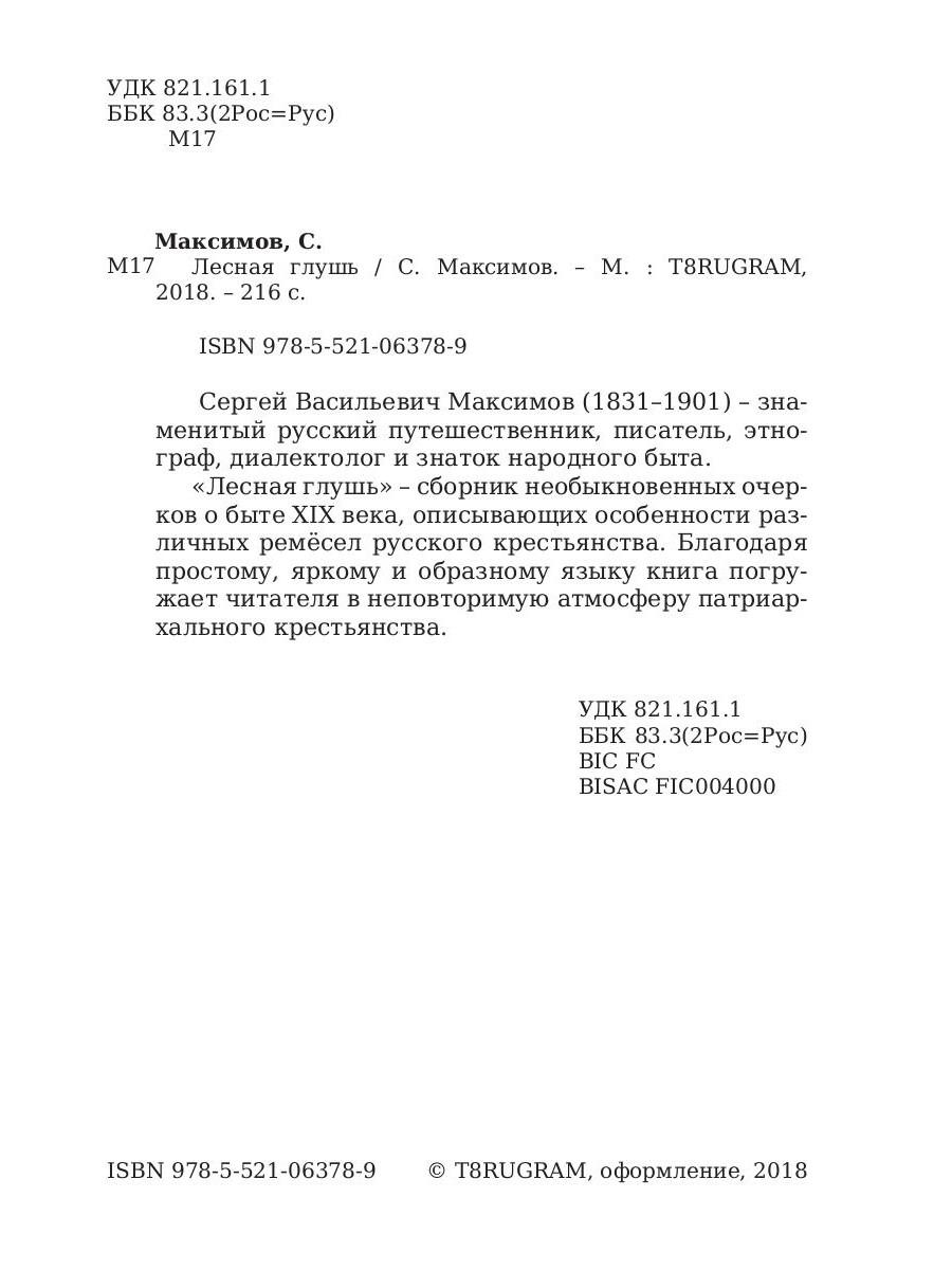 Сергей Васильевич Максимов (1831-1901) - знаменитый русский путешественник, писатель, этнограф, диалектолог и знаток народного быта. «Лесная глушь» - сборник необыкновенных очерков о быте XIX века, описывающих особенности различных ремёсел русского крестьянства. Благодаря простому, яркому и образному языку книга погружает читателя в неповторимую атмосферу патриархального крестьянства.