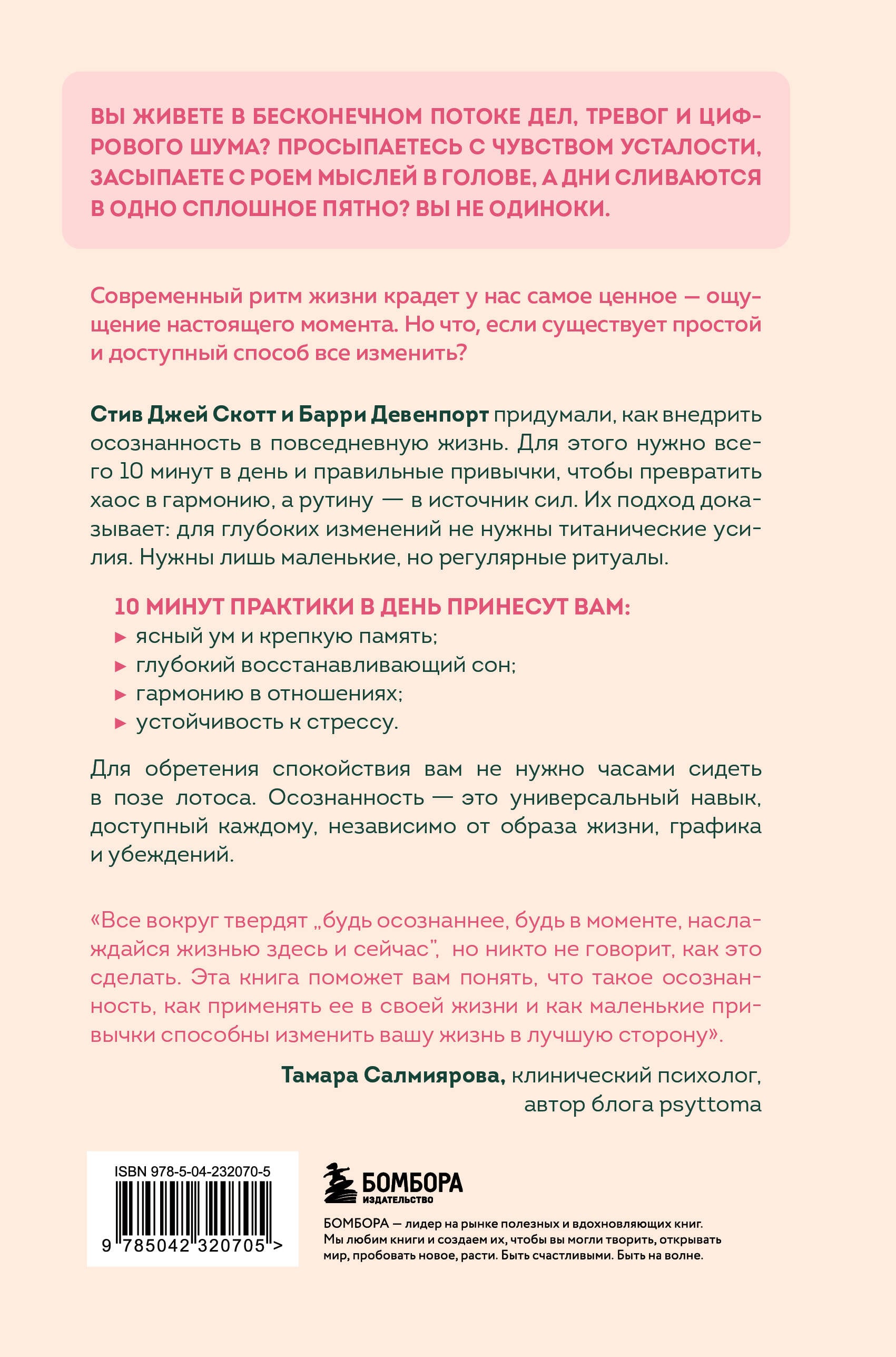 Вы живете в бесконечном потоке дел, тревог и цифрового шума? Просыпаетесь с чувством усталости, засыпаете с роем мыслей в голове, а дни сливаются в одно сплошное пятно? Вы не одиноки. Современный ритм жизни крадет у нас самое ценное - ощущение настоящего момента. Но что, если существует простой и доступный способ все изменить? Стив Джей Скотт и Барри Девенпорт, авторы бестселлера «Осознанные отношения. 25 привычек для пар, которые помогут обрести настоящую близость» помогли десяткам тысяч пар по всему миру наладить отношения, а в новой книге предлагают четкий и эффективный план по внедрению привычек во всех сферах жизни. 1. Практические методы для формирования устойчивой привычки. 2. Интеграция в ваш режим дня - от пробуждения до отхода ко сну. 3. Простота и доступность. Чтобы стать спокойнее и счастливее, вам не нужны часовые медитации в позе лотоса. Осознанность - это умение присутствовать телом и головой в том, что вы делаете: будь то важный проект или мытье холодильника. И этому можно научиться.| Издательство | ООО "Издательство "Эксмо" |