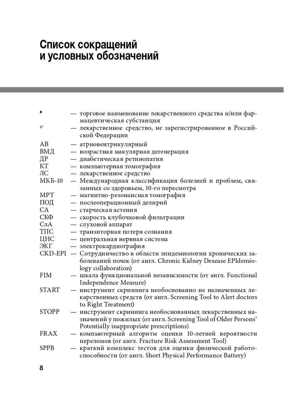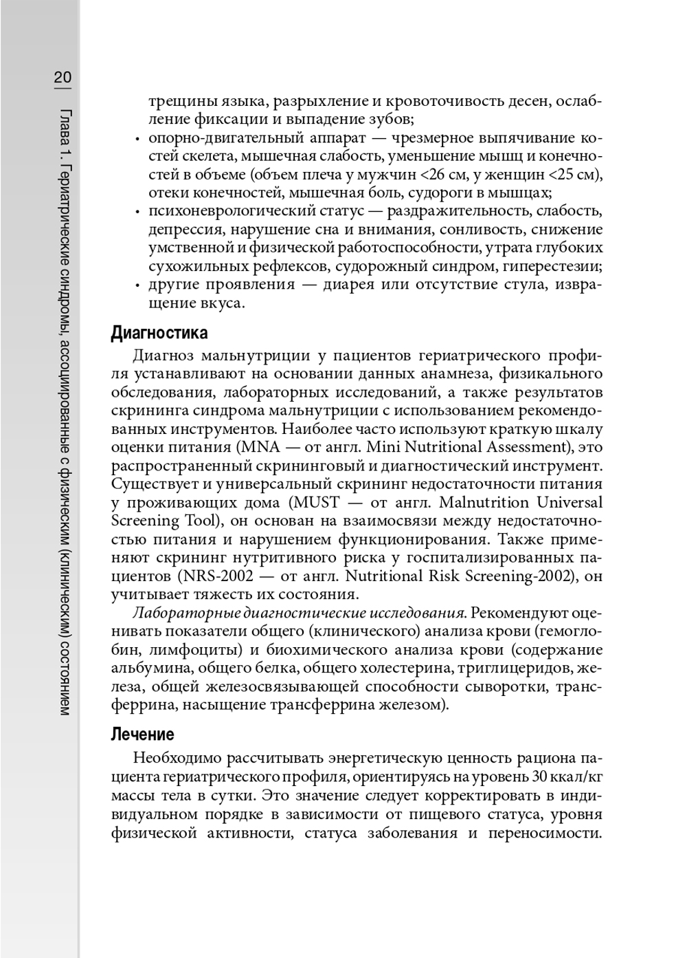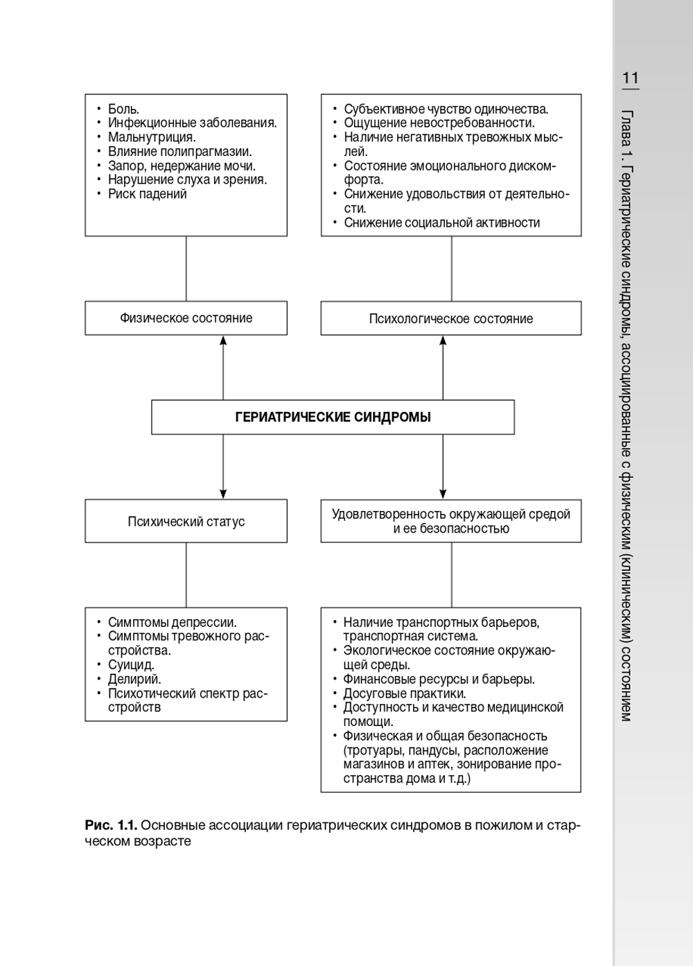 В руководстве рассмотрены основные гериатрические синдромы. Они рубрифицированы в зависимости от ассоциации с физическим (клиническим), психологическим состоянием, психическим статусом и удовлетворенностью окружающей средой и ее безопасностью. Представлены данные об их распространенности, причинах возникновения, классификации, клинической картине, диагностике и лечении, прогнозе и профилактике. Отдельно приведены гериатрические опросники для выявления основных гериатрических синдромов. Книга предназначена врачам-гериатрам, терапевтам, врачам общей практики, а также может быть полезна медицинским работникам, оказывающим помощь пожилым пациентам.| Издательство | ГЭОТАР-Медиа |