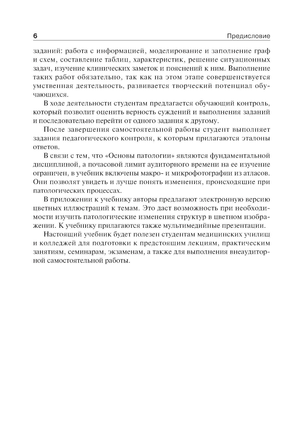 Учебник написан в соответствии с государственным образовательным стандартом и программой, разработанной Всероссийским учебно-методическим центром по непрерывному медицинскому и фармацевтическому образованию. Состоит из двух разделов: в первом рассмотрены общие вопросы патологии, которые лежат в основе болезней, а во втором - частная патология основных систем и органов. Для самостоятельной работы студентам предложены программа для самообучения и педагогический контроль. Учебник ориентирован на подготовку студентов медицинских училищ и колледжей, обучающихся по специальностям «Лечебное дело», «Сестринское дело», «Акушерское дело» и «Стоматология».| Издательство | ГЭОТАР-Медиа |